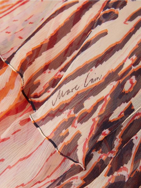 deze sjaal is gemaakt van zijde en voelt ragfijn licht aan op de huid. de gestileerde dierenbontprint heeft een pixeleffect en combineert rode tinten om een tropisch kleurenpalet te creëren. de randen van de sjaal zijn opgerold.
