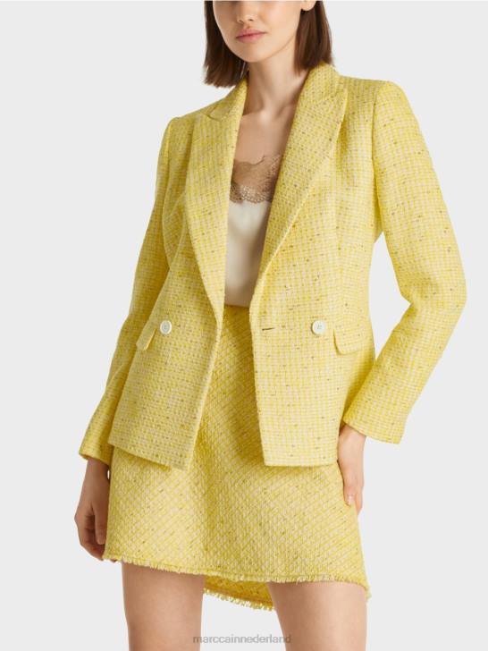 de blazer is gemaakt van zomers katoenen tweed met lurexgaren voor een delicaat glinsterend effect. de blazer heeft een getailleerd silhouet en wordt gepresenteerd met twee knopen. de manchetten zijn gespleten en elk heeft drie knopen.