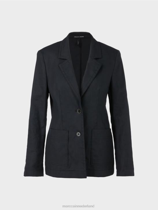 zomerse blazer in linnen, katoen en elasthaan. deze single-breasted blazer sluit nauw aan en is voorzien van twee Marc Cain-knopen. het subtiele riblint op de kraag zorgt voor een sportief accent. de opgestikte zakken versterken de casual touch, die klassiek wordt gecompleteerd door de revers.