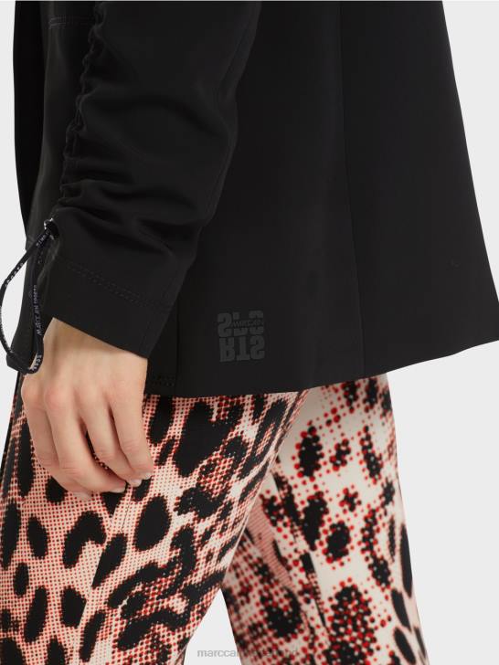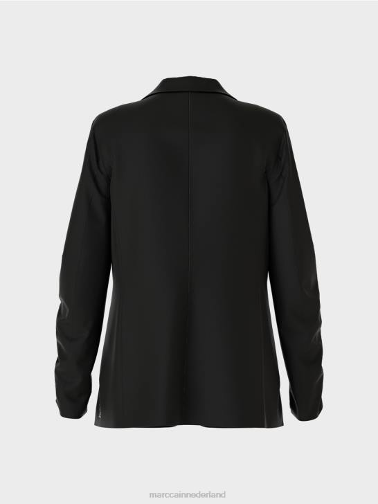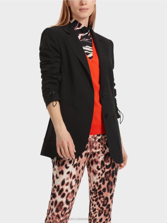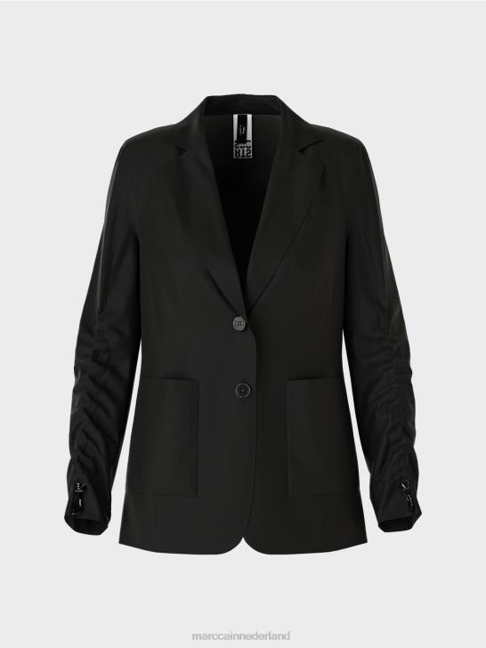blazer gemaakt van technisch materiaal. de nauwsluitende vorm wordt gecreëerd door prinsessennaden aan de voor- en achterkant en extra buste-naden. een eyecatcher is het trekkoord bij de mouw, waardoor een plooitje mogelijk is. Langs de randen zijn decoratieve stiksels te vinden.