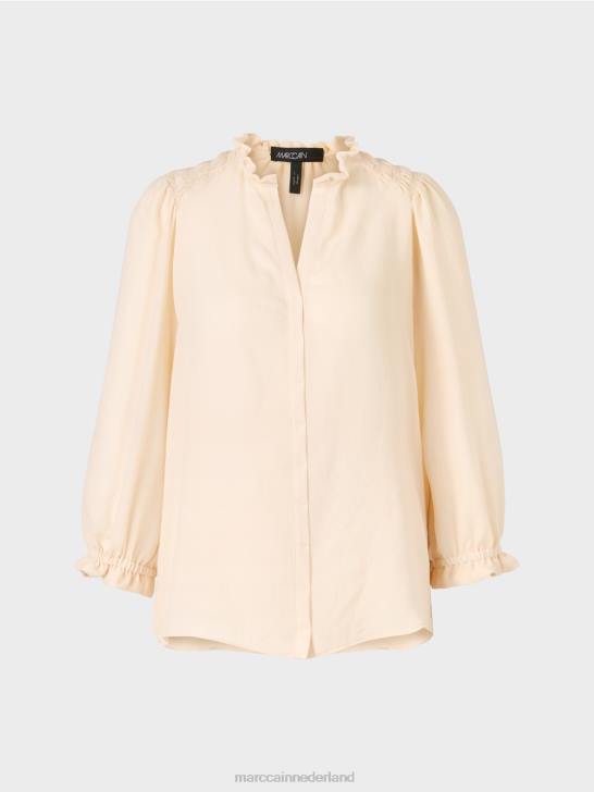 het materiaal van de blouse zorgt voor een zacht vloeiend silhouet. Bij de schouder is de wijdte van de raglanmouw verstelbaar met een opvallend smokeffect. een kraag met ruches past perfect bij deze stijl, terwijl de nepsluiting aan de voorkant een decoratief detail toevoegt. deze blouse draagt het duurzaamheidslabel ‘rethink Together’.