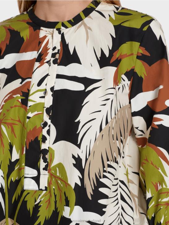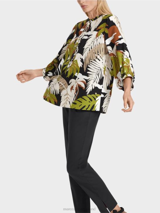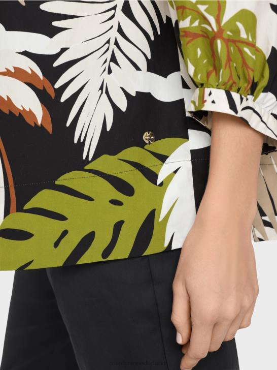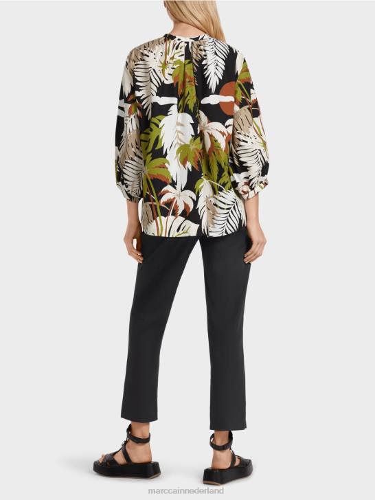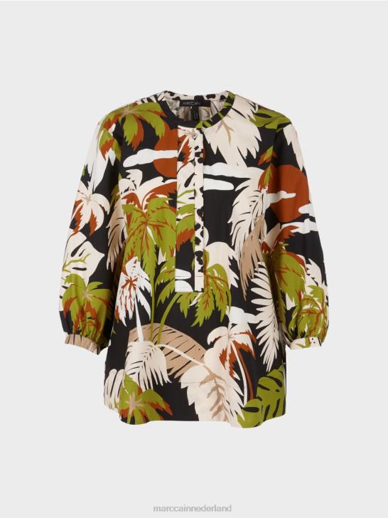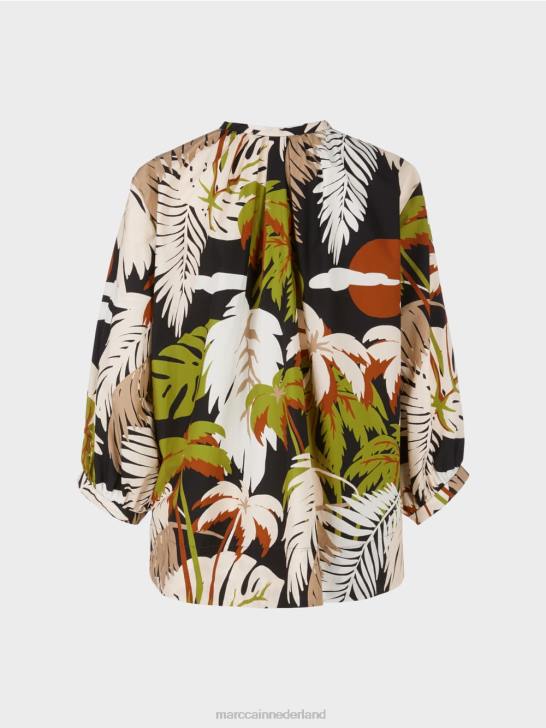 de kleuren en tropische print doen denken aan de stijl van de jaren zeventig. deze katoenen blouse is ruim gesneden en licht uitlopend. het volume aan de achterzijde wordt bereikt door plooien bij de halslijn. de blouse wordt aan de voorkant gesloten met een knoopsluiting. een smalle manchet plooit de mouw om een ​​opvallend kenmerk te creëren.