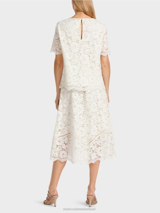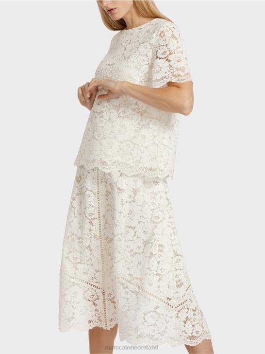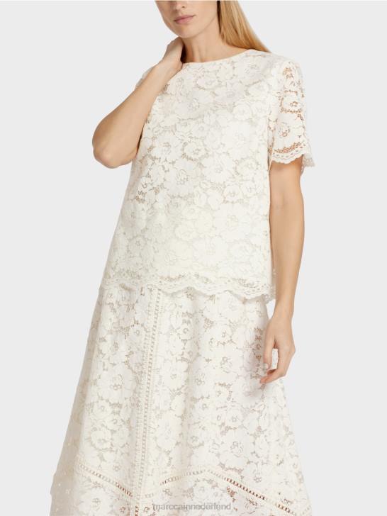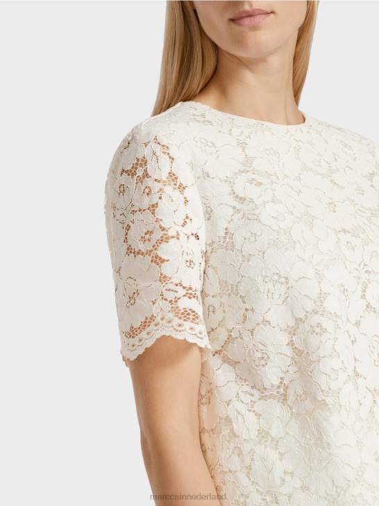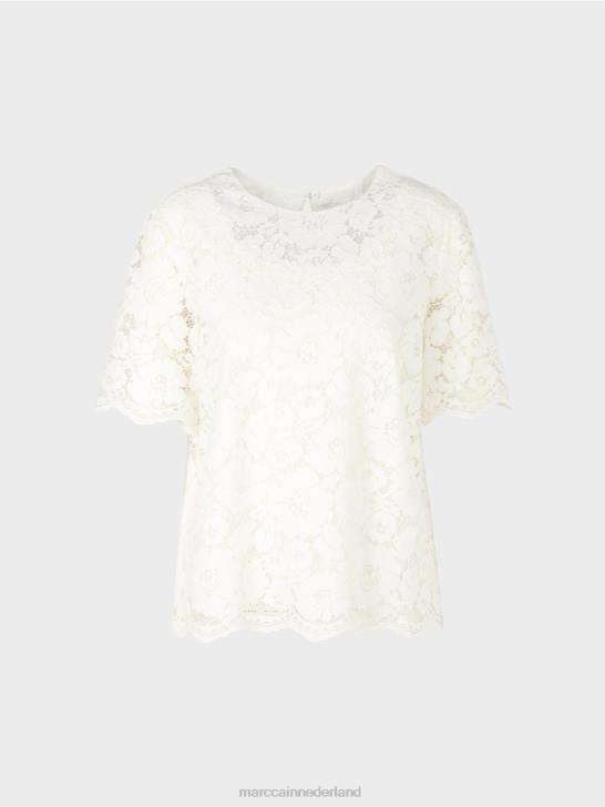 de eenvoudige snit van deze blouse doet denken aan de stijl van de jaren vijftig: rechte snit, ronde halslijn en korte mouwen. het gebloemde kant is aan de zoom afgewerkt met een rand. de gedeeltelijke voering maakt de blouse ondoorzichtig. het sluit met een enkele knoop aan de achterkant.