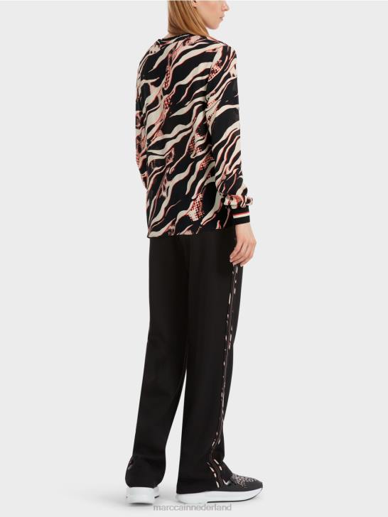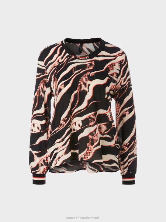de blouse is gemaakt van puur zacht vloeiende viscose. de snit is breed en de schouders overlappen elkaar. de halslijn is verzameld en heeft een impliciete volant. de mouw is vastgemaakt met een gebreide manchet. de leeuwafdruk is effectief vanwege de gedeeltelijk grove pixelresolutie en het kleurenschema.