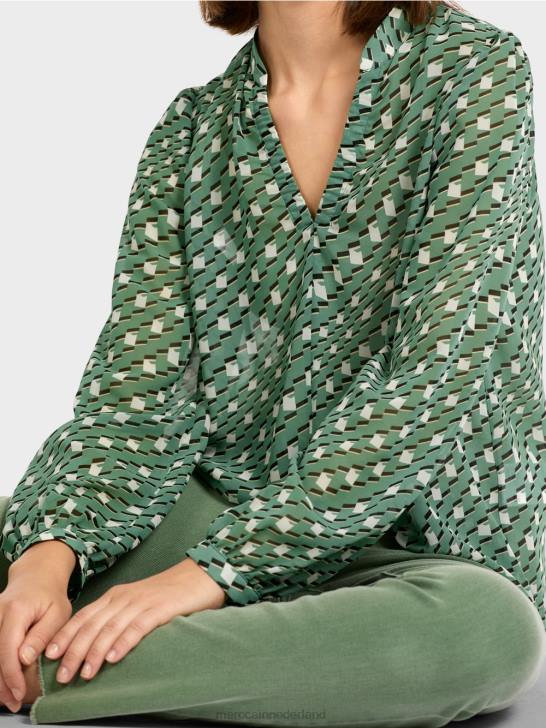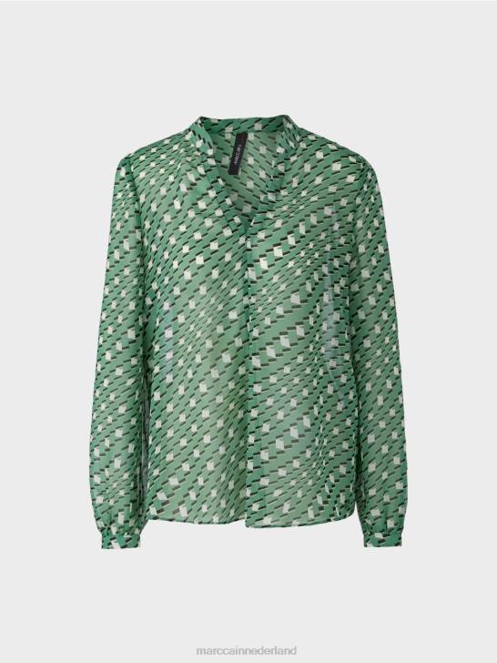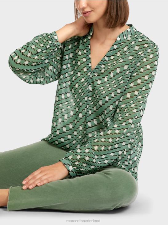losvallende blouse met v-hals en middennaad. het geometrische patroon geeft deze blouse een interessante uitstraling. het heeft een los silhouet en is voorzien van een middennaad. smalle manchetten met metalen knoop en het kleine opstaande kraagje met v-hals accentueren het blousedesign.
