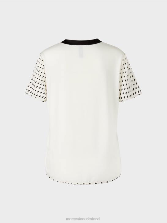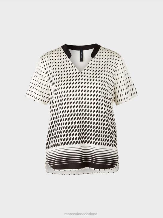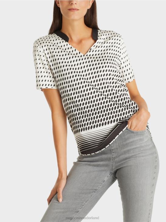 het blouseshirt presenteert zich met een patroonmix van strepen en stippen. de zoom van het blouseoverhemd is afgerond en de v-hals is versierd met een kleine decoratieve bies. de effen achterkant is iets langwerpig en gemaakt van bamboevezel.
