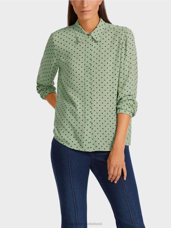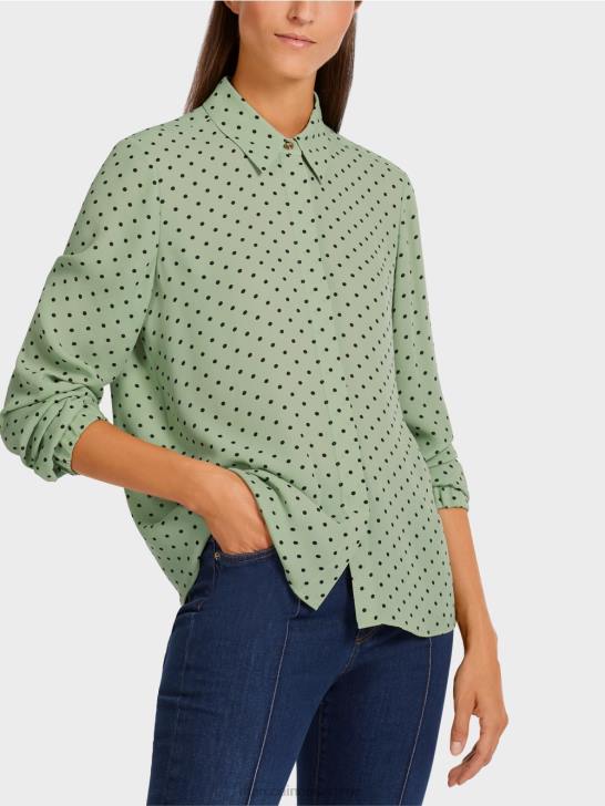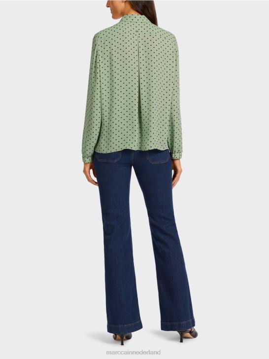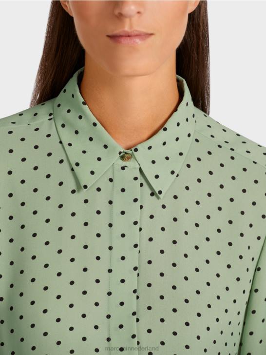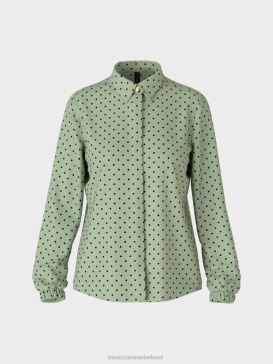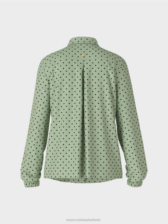 het ontwerp van deze polkadotblouse is minimalistisch en teruggebracht tot de essentie. de knoopsluiting is verborgen en de mouwen zijn afgewerkt met een elastische bies. de stof geeft de boxy-vorm een zacht silhouet.