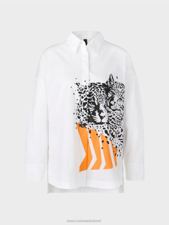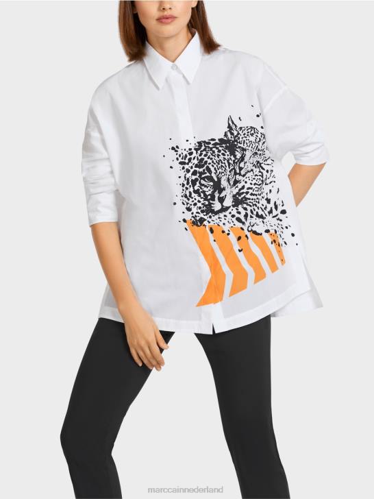 de blouse is gemaakt van biologisch katoen en draagt het duurzaamheidslabel 'rethink Together'. het hoogtepunt is de opvallende luipaardprint. Het item heeft een verborgen knoopsluiting, manchetten met één knoop en zijsplitten.