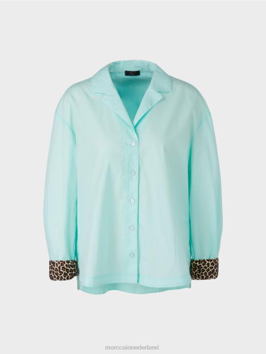 vrouwelijke blouse met reverskraag. de kraag van deze blouse doet denken aan de stijl van de jaren vijftig. de manchetten zijn voorzien van een luipaardprint en kunnen worden omgeslagen voor een opvallend effect. de zijsplitten zijn naar voren afgerond. het kledingstuk wordt aan de achterkant vanaf de zadelnaad geplooid. deze blouse is gemaakt van biologisch katoen en draagt het duurzaamheidslabel ‘rethink Together’.