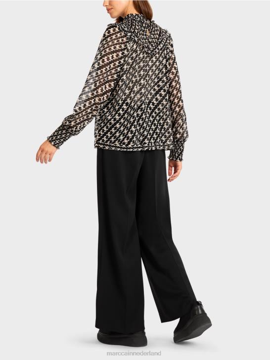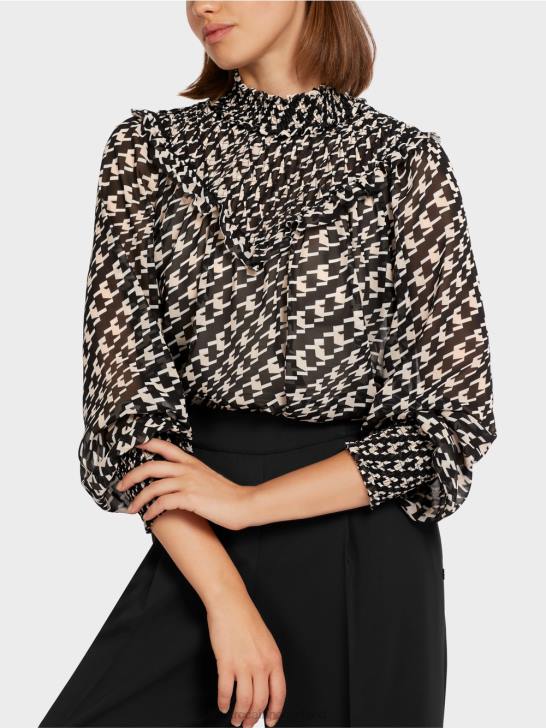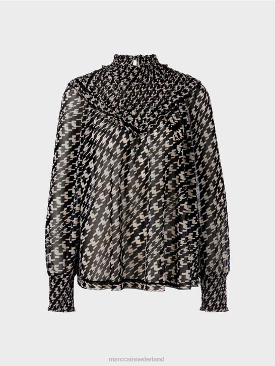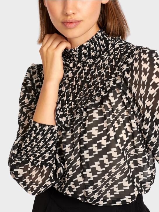 wijde blouse in a-vorm met smoked details. deze blouse heeft een extravagant dessin in een opvallende mix van klassieke herderruitjes met speelse accenten. het heeft een hoge kraag, die is gesmokt, passend bij de mouwzomen. Ook het schouderstuk is voorzien van gesmokte details en heeft een v-vormige afwerking. het wijde silhouet maakt het vrouwelijke design compleet.