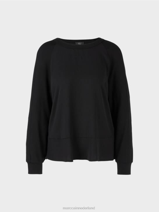 de raglanblouse combineert het comfort van een t-shirt met de elegantie van een blouse: de mouwen en achterkant zijn gemaakt van katoenen rib, de voorkant is gemaakt van een zacht vloeiende en glanzende stof. Er zit een subtiele volant aan de zoom.