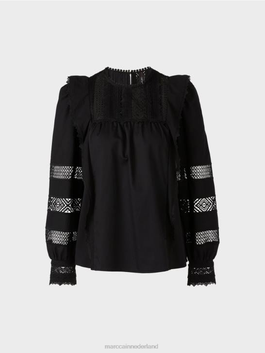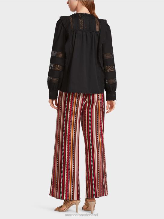 deze katoenen blouse is geïnspireerd op traditionele etnische kledingontwerpen. het schouderstuk en de mouwen zijn uitvoerig afgewerkt met kanten bies. de juknaad is geplooid. de volant die loopt van schouder tot zoom geeft het geheel een eigentijdse twist. de blouse wordt gesloten met een knoop in de nek.