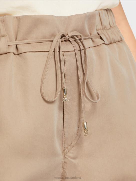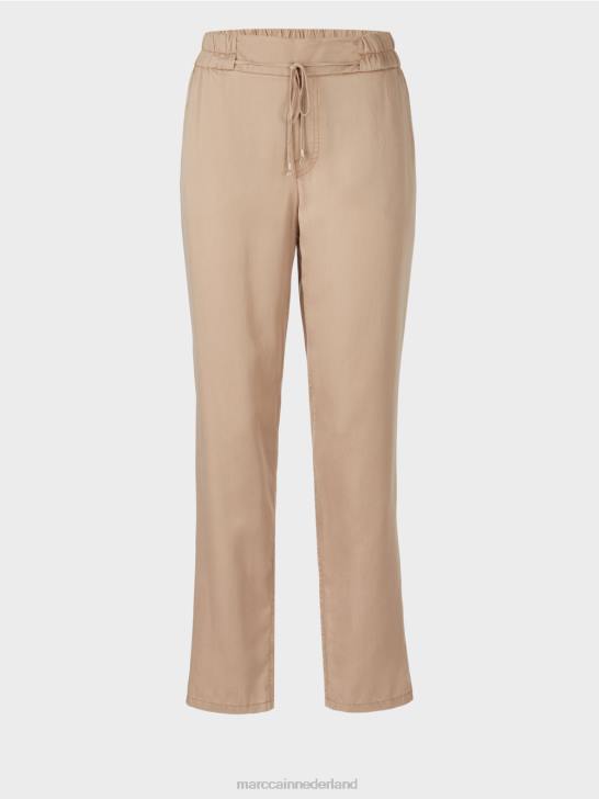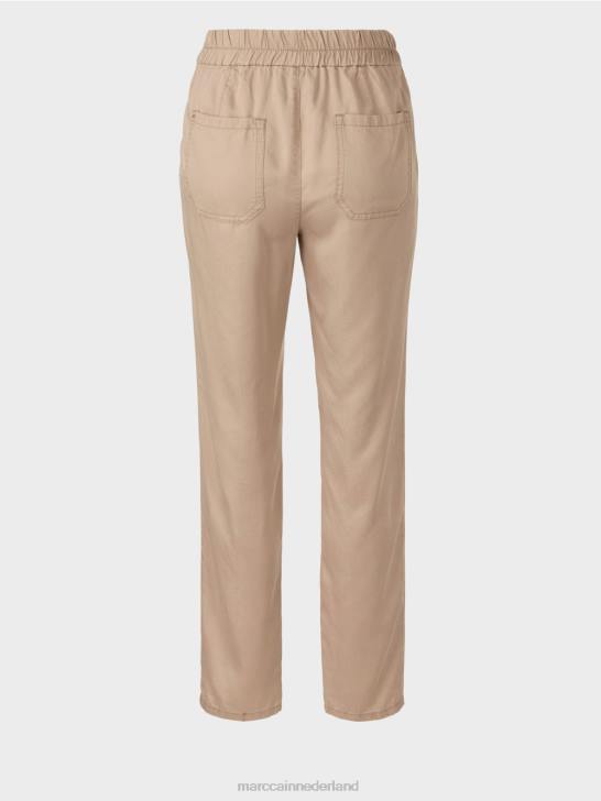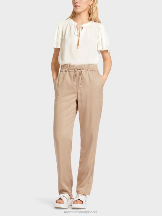 deze rivera broek valt wijd in de heup en het been loopt taps toe naar de enkels. de tailleband is aan de voorkant glad en aan de zijkanten en achterkant in joggerstijl. een eyecatcher is het trekkoord met decoratieve elementen aan de uiteinden. de broek heeft opgestikte zakken aan de achterkant. dit kledingstuk is gemaakt van de hernieuwbare grondstof lyocell en draagt het duurzaamheidslabel ‘rethink Together’.