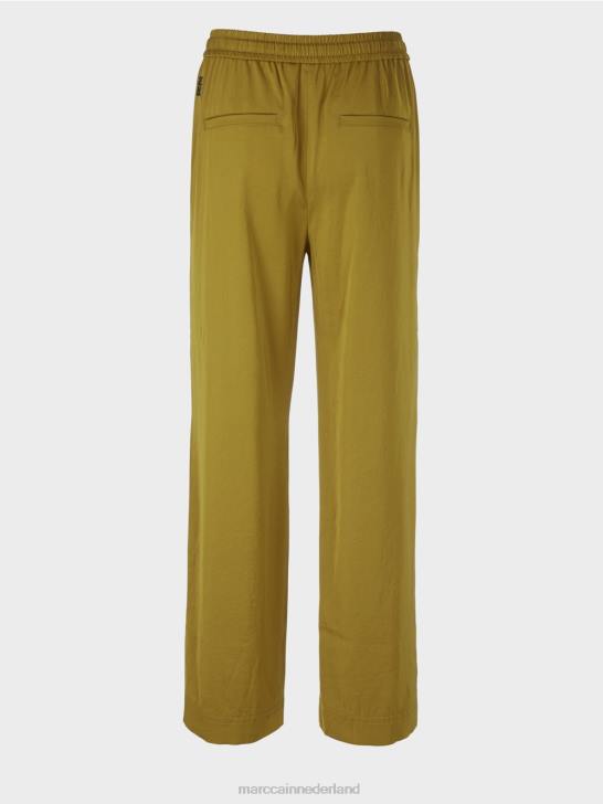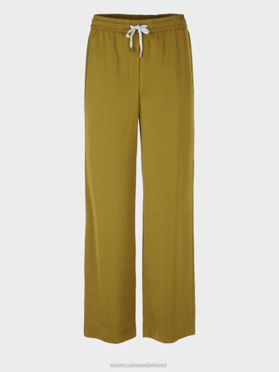 ontspannen elegantie. de broek is smal in de taille en de heupen en benen zijn nonchalant los. de viscosestof geeft deze broek een zacht vloeiend silhouet en een subtiele glans. Het kledingstuk heeft een joggingband en vier zakken: twee steekzakken aan de voorkant en twee paspelzakken aan de achterkant.