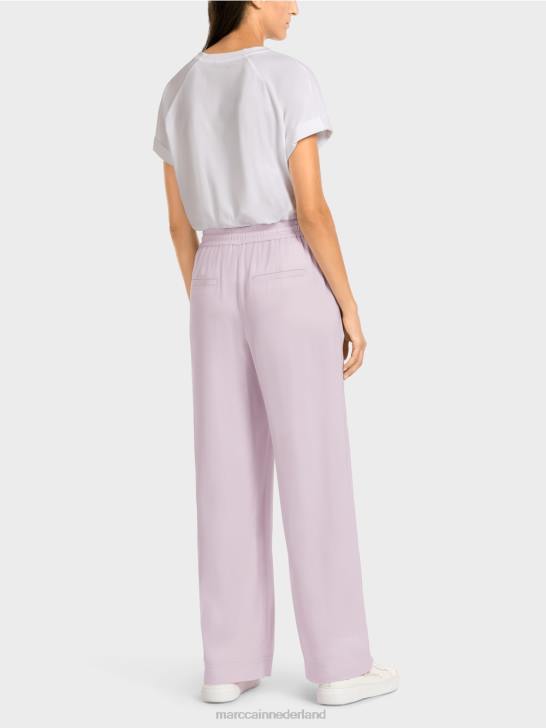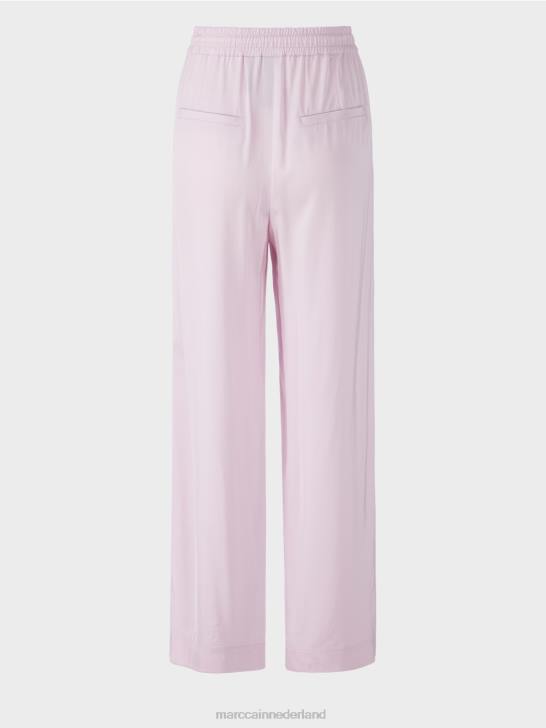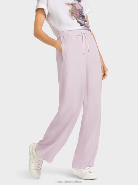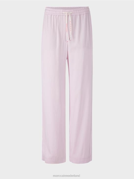 ontspannen elegantie. de broek is smal in de taille en de heupen en benen zijn nonchalant los. de viscosestof geeft deze broek een zacht vloeiend silhouet en een subtiele glans. Het kledingstuk heeft een joggingband en vier zakken: twee steekzakken aan de voorkant en twee paspelzakken aan de achterkant.