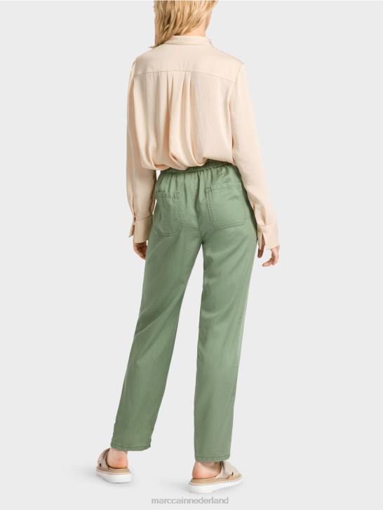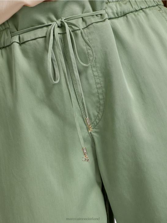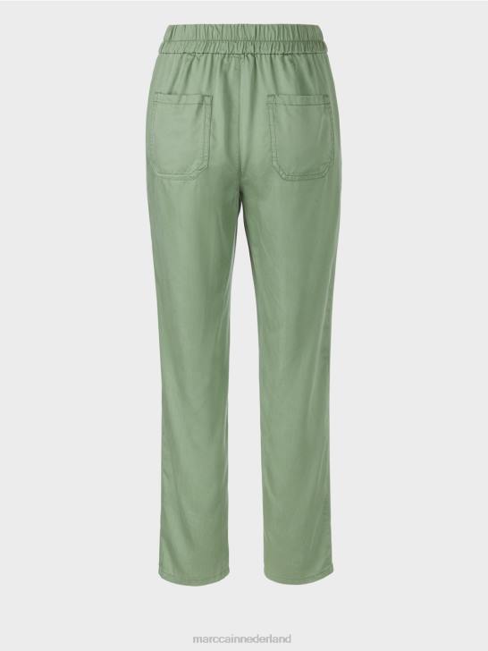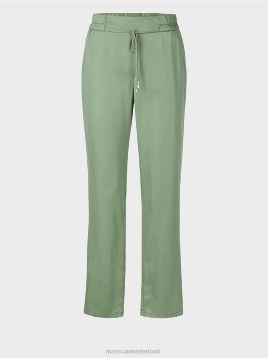 deze rivera broek valt wijd in de heup en het been loopt taps toe naar de enkels. de tailleband is aan de voorkant glad en aan de zijkanten en achterkant in joggerstijl. een eyecatcher is het trekkoord met decoratieve elementen aan de uiteinden. de broek heeft opgestikte zakken aan de achterkant. dit kledingstuk is gemaakt van de hernieuwbare grondstof lyocell en draagt het duurzaamheidslabel ‘rethink Together’.