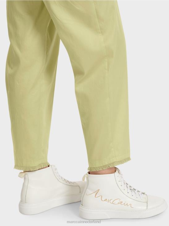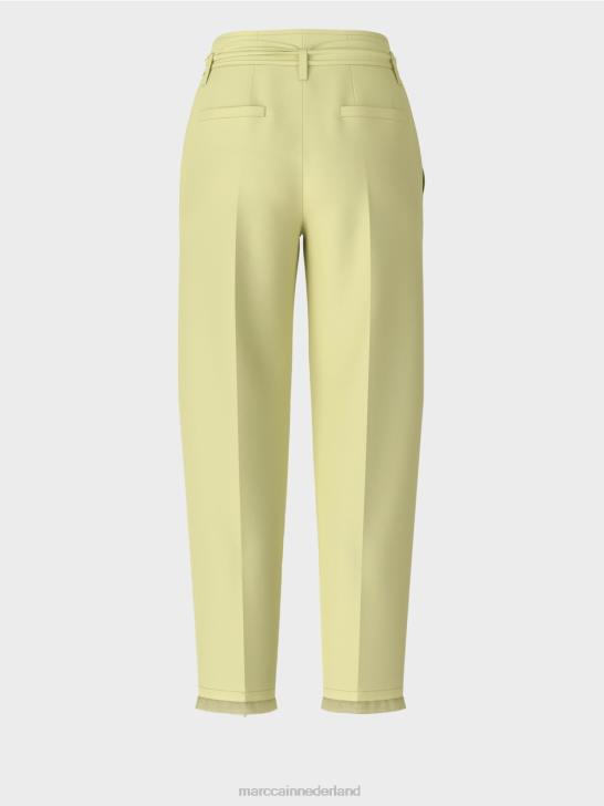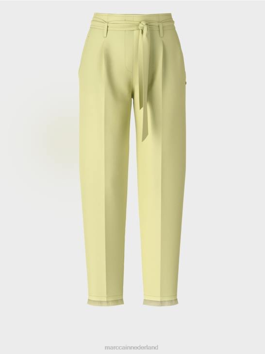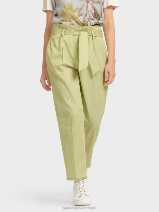 losse, casual pasvorm op de heup en smal aan de zoom en taille. de hoge tailleband van de broek lijkt dankzij de riem op een geknepen papieren zak, vandaar de term "paperbag-stijl". Verder heeft de broek een geperste vouw, steekzakken aan de voorkant en paspelzakken aan de achterkant.
