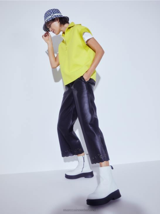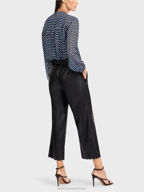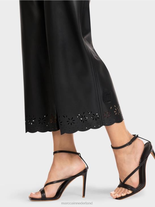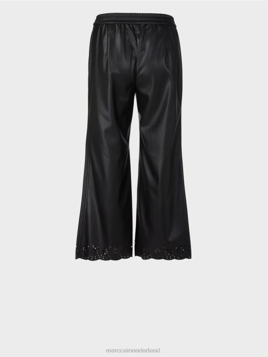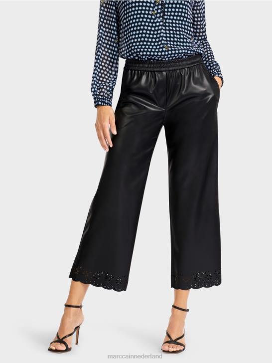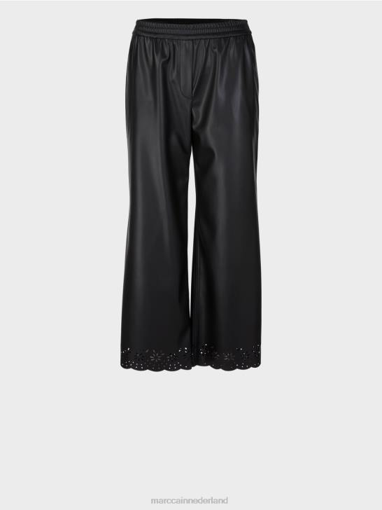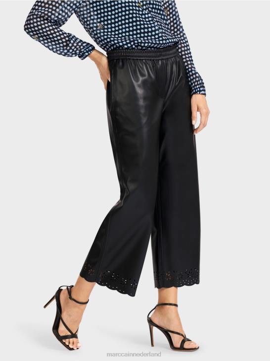 de losse pasvorm en de romantische ajourrand dagen het rockimago van zwart kunstleer uit. de authentieke leerlook ontstaat door de polyurethaan coating. de broek heeft steekzakken aan de zijkant en een elastische tailleband.