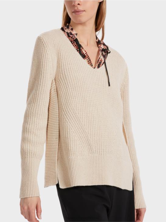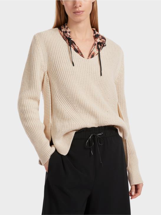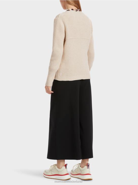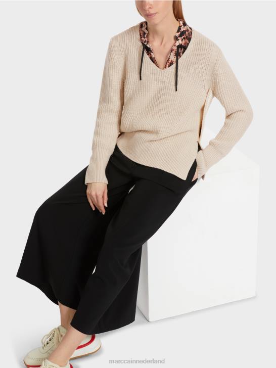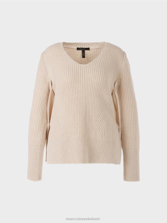 de gebreide trui is gemaakt van een elegante garenmix met een hoog kasjmiergehalte. het silhouet is smal bij de schouder en breed bij het lichaam. het centrale ontwerpkenmerk is te vinden in de overlap van de voor- en achterpanelen. waarbij de streep eenzijdig is. de trui is "gebreid in Duitsland": hij wordt gebreid en verfraaid in Duitsland met behulp van de nieuwste technologieën. de afzonderlijke delen, zoals de rug en mouwen enz., worden in Europese partnerbedrijven aan elkaar genaaid.