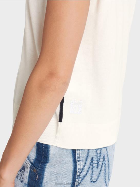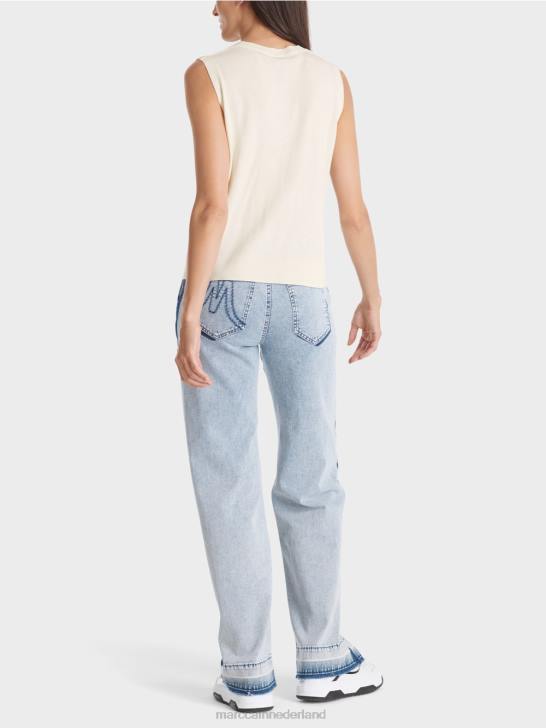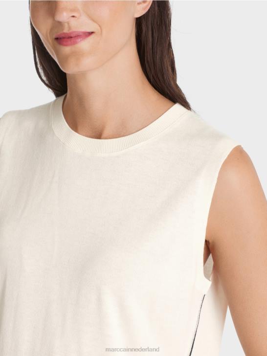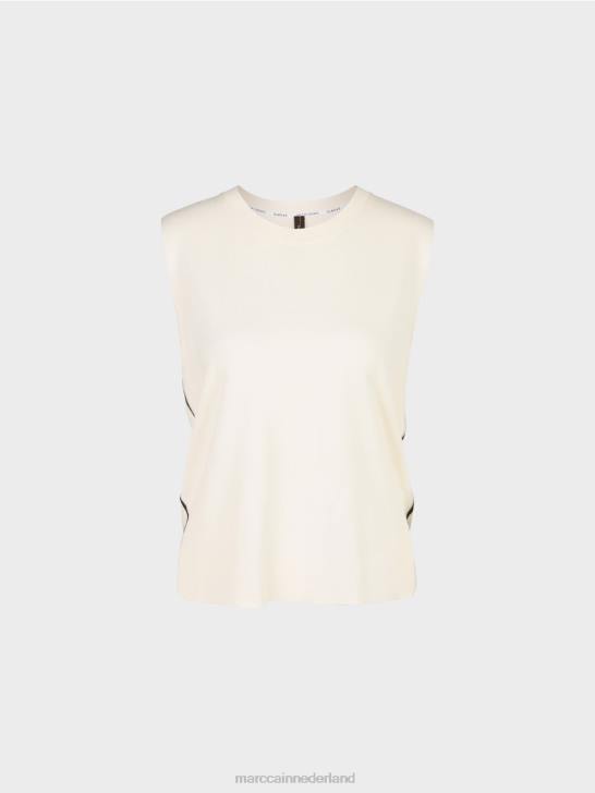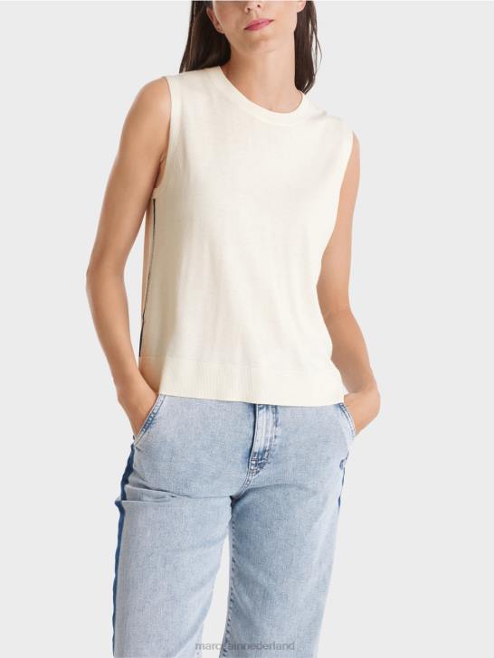 de schoonheid van de slipover ligt in het minimalistische ontwerp en de zachte garenmix. de vezel is op wolbasis en bevat viscose en kasjmier. designkenmerken zijn onder meer de opvallende schoudernaad en de contrasterende streep in de zijnaad.