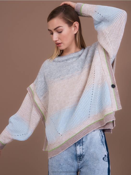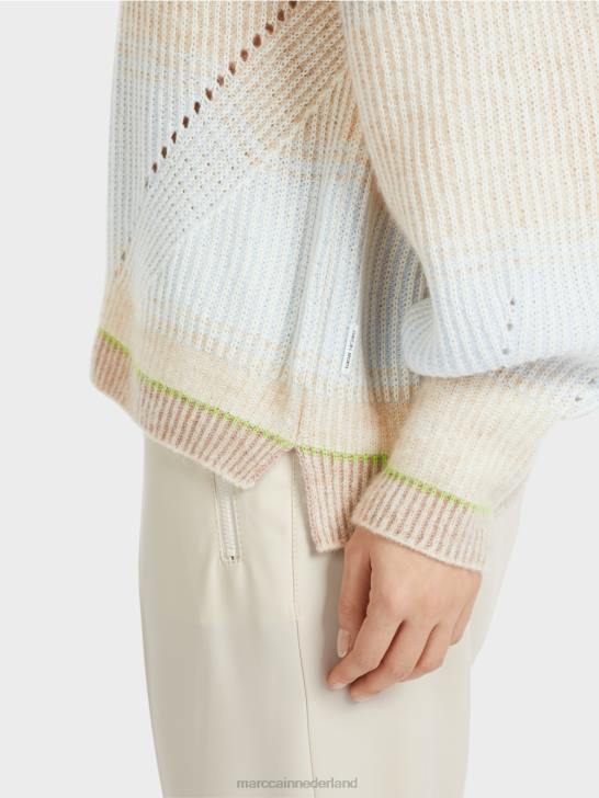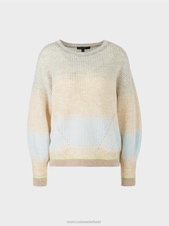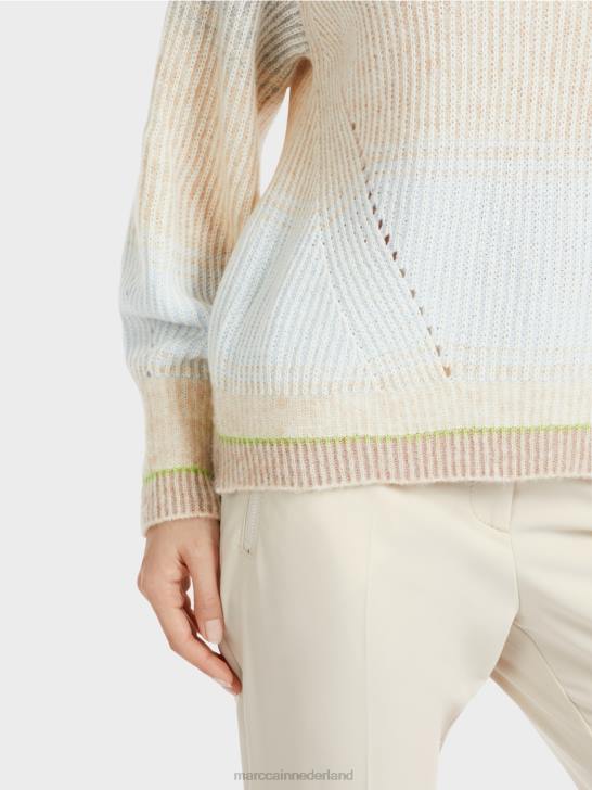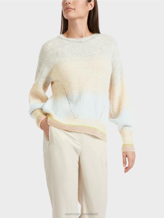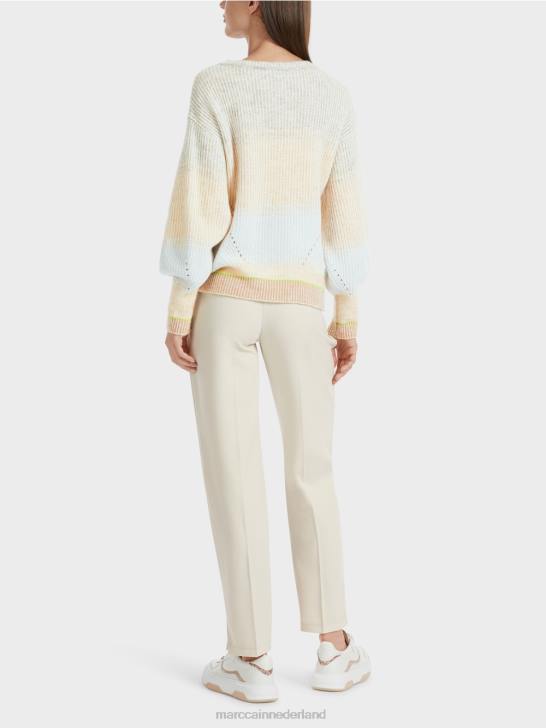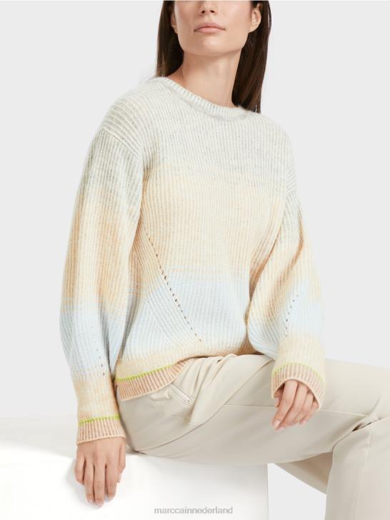 het karakteristieke kenmerk van de gebreide trui is de eivorm. de mouw heeft ook een bolvormige vormgeving boven de manchet. het subtiele kleurverloop en de manchet geaccentueerd in fluorkleur zijn effectief. het mele-achtige effect ontstaat doordat de effen en omgekeerde steken verschillende kleuren hebben.