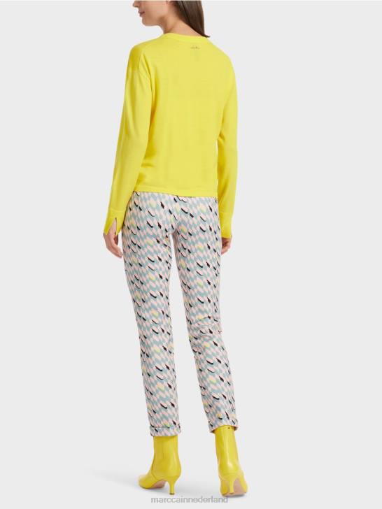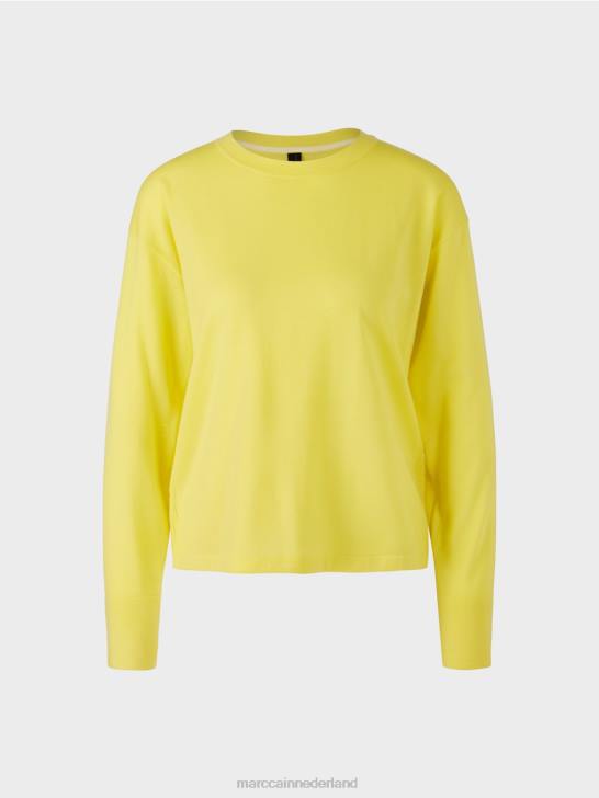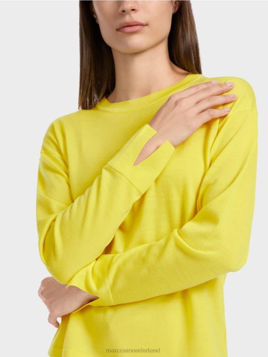 casual snit trui van het duurzaamheidslabel "rethink Together". deze trui is gemaakt van lichtgewicht gebreid materiaal gemaakt van 100% scheerwol. het heeft een ronde halslijn en splitmanchetten. een klein, glanzend goud Marc Cain-logo is op de achterkant genaaid voor een vrouwelijke touch.