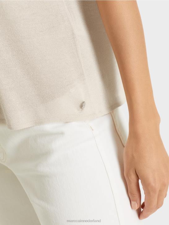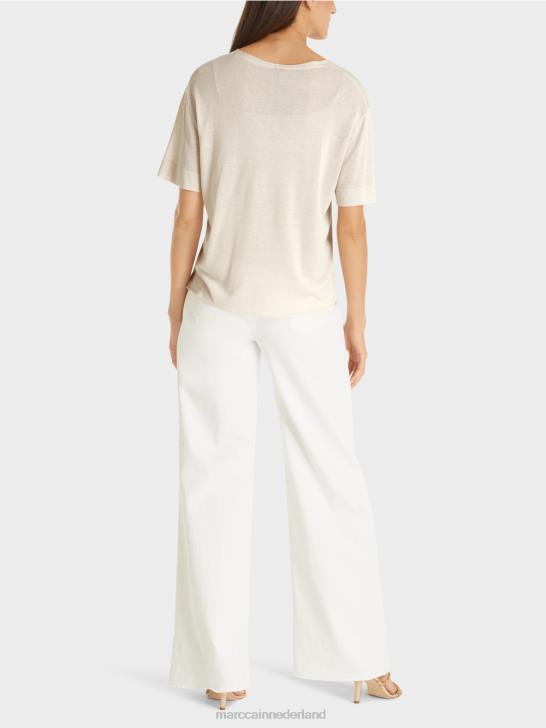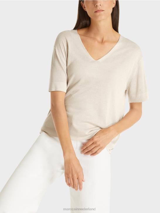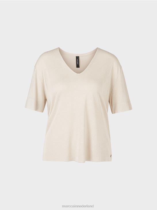delicate trui met korte mouwen en v-hals. het item is gemaakt van viscose met lurexgaren, wat zorgt voor een glinsterend effect. aan de zoom is een kleine zilveren logohanger geplaatst.