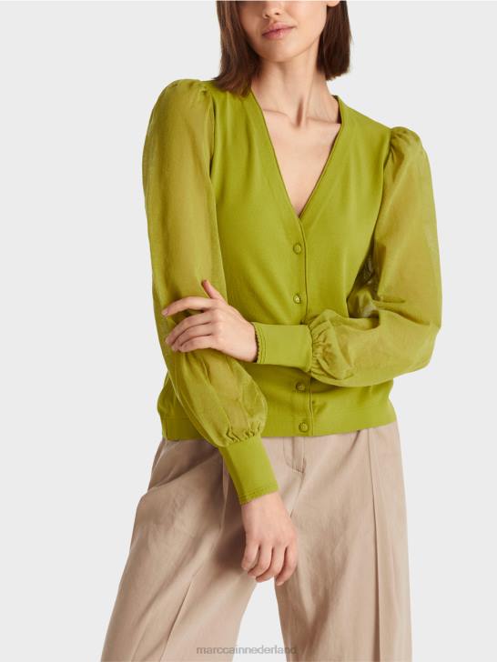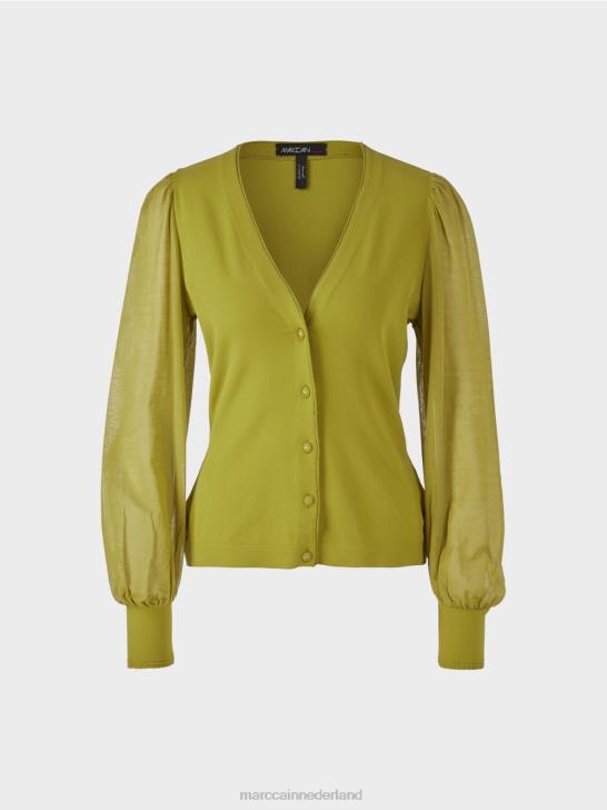 het vest sluit nauw aan en heeft licht geplooide mouwen, verwijzend naar de stijl van de jaren dertig. het lijfje is gebreid en de mouwen zijn gemaakt van geweven stof. de manchetten zijn ook gebreid. de knopen zijn voorzien van een Marc Cain-logo. het vest is "gebreid in Duitsland". het wordt in Duitsland gebreid en afgewerkt met de nieuwste technologie en de afzonderlijke stukken zoals de mouwen en voorkant enz. worden bij onze Europese partnerbedrijven aan elkaar genaaid.