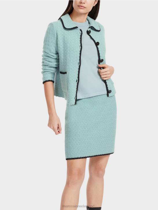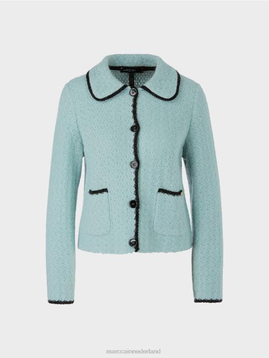 vest in blazerstijl met kraag en opgestikte zakken. Het jasje heeft een nauwsluitende snit en wordt op onze locatie in Duitsland gebreid en afgewerkt met een materiaalmix van katoen, mohair, alpaca en wol. de verdere verwerking van de afzonderlijke onderdelen wordt uitgevoerd door Europese partnerbedrijven. dit betekent dat het artikel "gebreid in Duitsland" is. mooi detail is de contrasterende gekleurde rand.