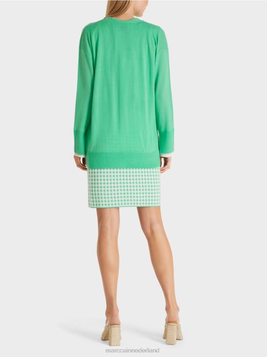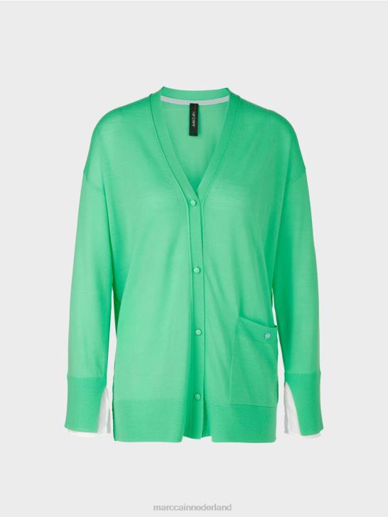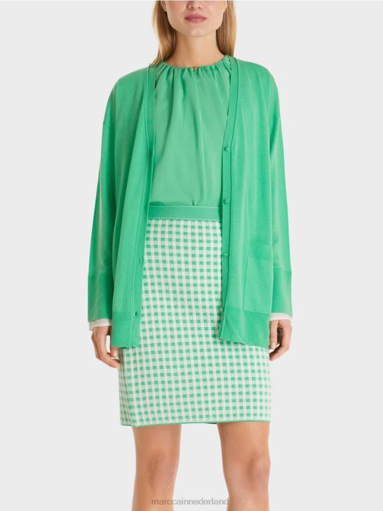 dit elegante vest is nonchalant los en heeft laag aangezette mouwen. het delicate breisel wordt geaccentueerd met stevige randen. de mouwzoom is bedekt met contrasterend materiaal om de indruk te wekken van een blousemouw die naar buiten gluurt en voegt een chique detail toe.