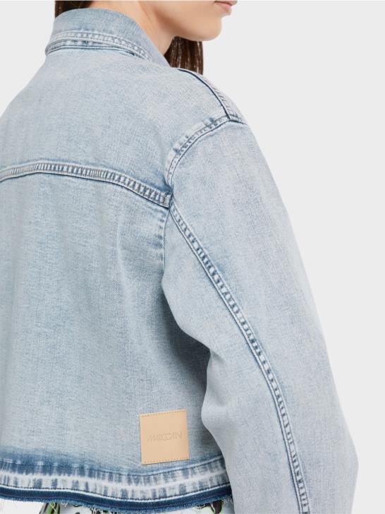 het spijkerjack heeft een vintage uitstraling. door de donkere vlekken lijkt het alsof het is verbouwd in een doe-het-zelf-stijl. de voorkant is voorzien van plooizakken en een knoopsluiting met metalen knopen. de zoom is afgerond.