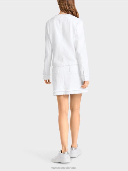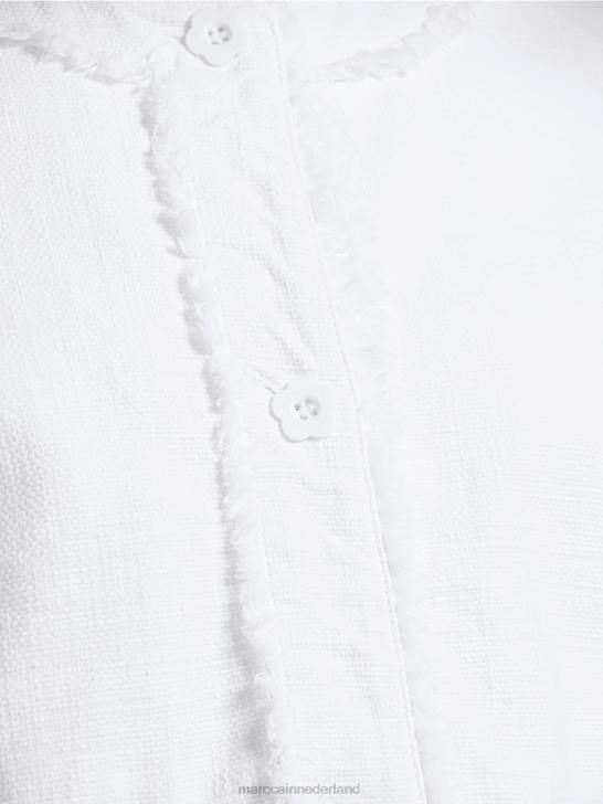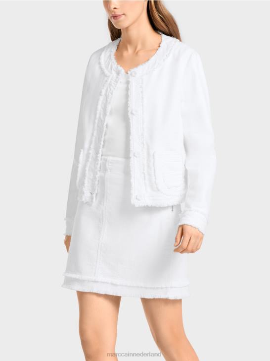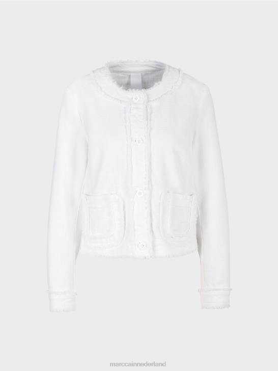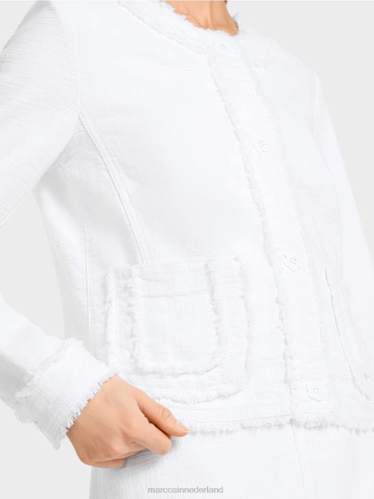 vrouwelijk jasje van katoen met elastaan. dit jasje heeft speelse franjes aan de zoom, de panelen en de manchetten. de afgeronde zakken zijn eveneens versierd met franjes. het jasje sluit met romantische bloemenknopen. figuurnaden en prinsessennaden zorgen voor een nauwsluitende pasvorm.