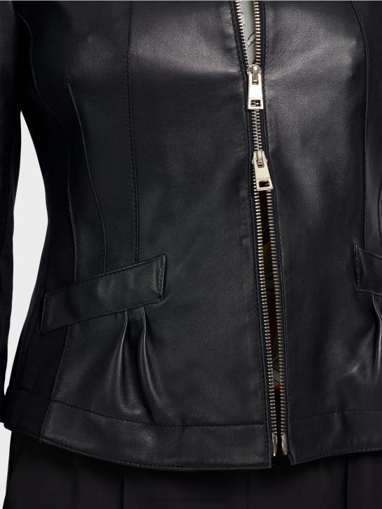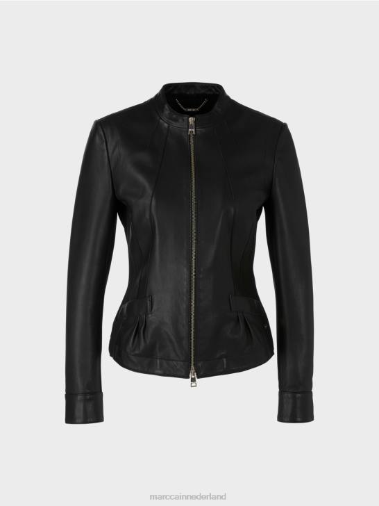 deze jas is gemaakt van fijn leer en heeft een stretchy jersey inzetstuk. in mooi contrast met de nauwsluitende snit zijn de twee volumineuze zakken. De jas wordt op klassieke wijze gesloten met een metalen tweewegritssluiting. mouwen met manchetten en een opstaande kraag maken het ontwerp compleet.