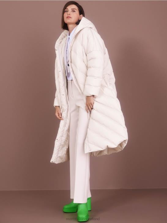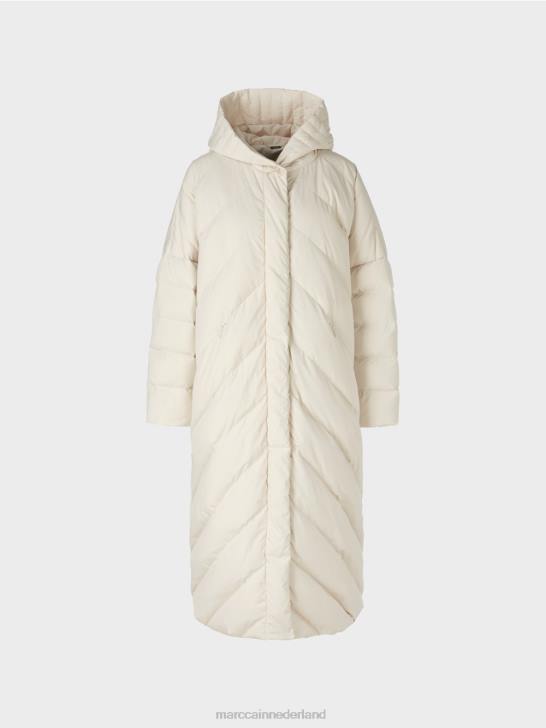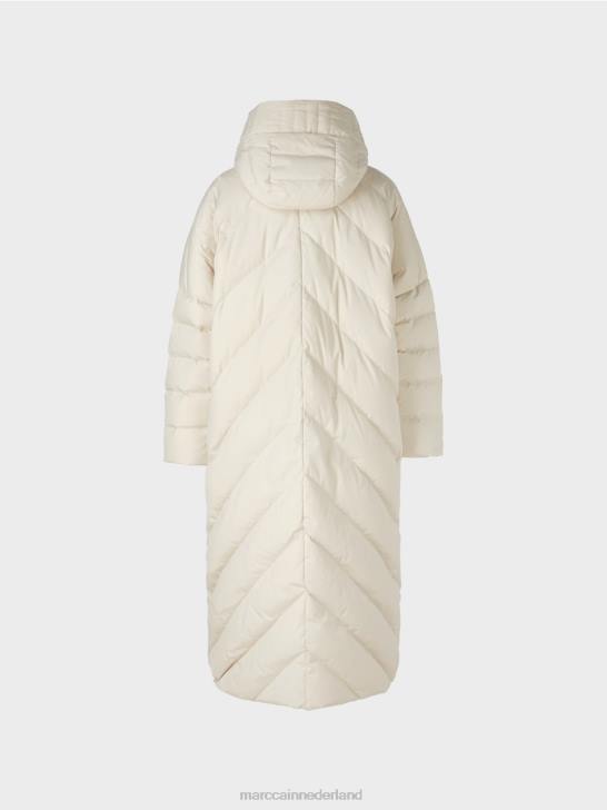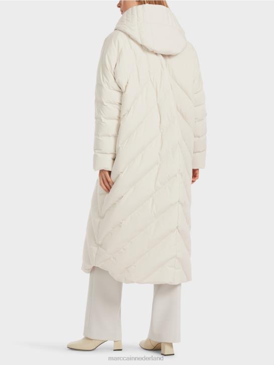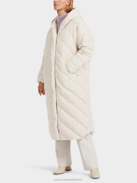 moderne gewatteerde jas van een duurzame materiaalmix met verwarmende vulling. deze lange jas heeft een losse pasvorm en een beschermende capuchon. Het wordt gesloten met een tweewegritssluiting en drukknopen. de binnenvoering is versierd met het Marc Cain-opschrift.