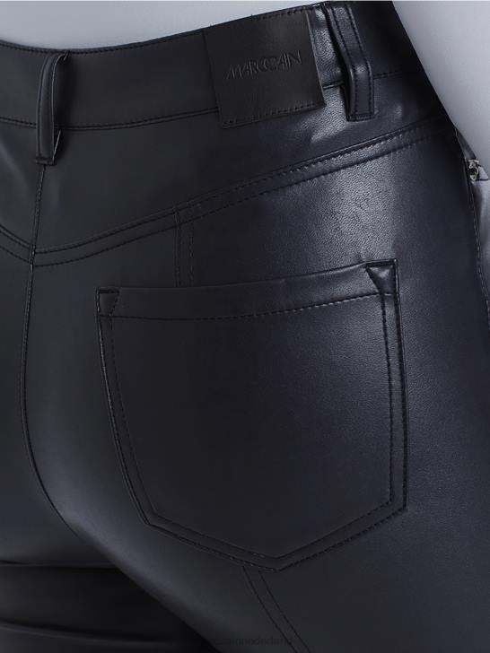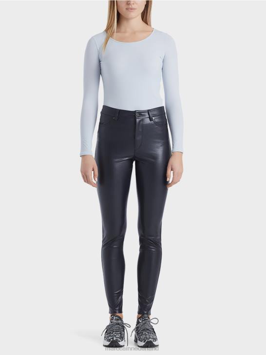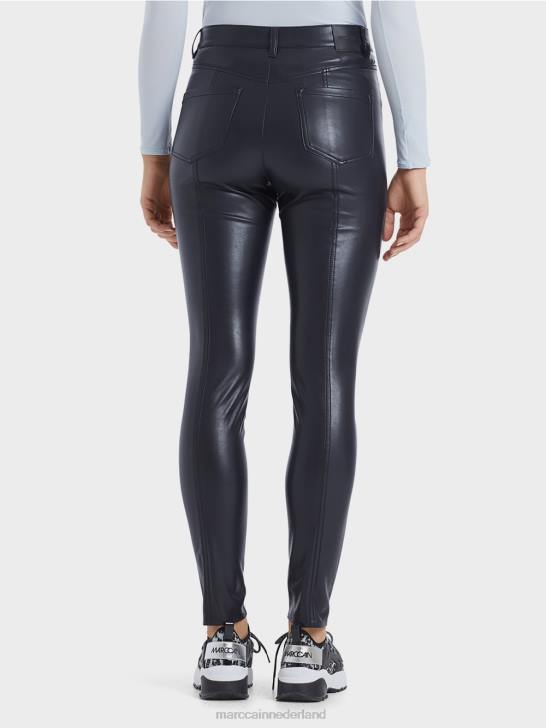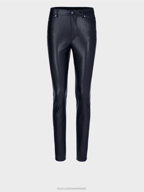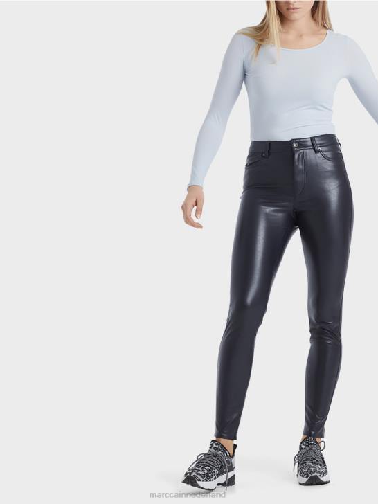 elegante stretchbroek met nauwsluitende snit, hoge tailleband en smalle pijpen. De regenpijpbroek is gemaakt van licht glanzend imitatieleer en voorzien van vier zakken, riemlussen, een logoknoop en ritssluiting.