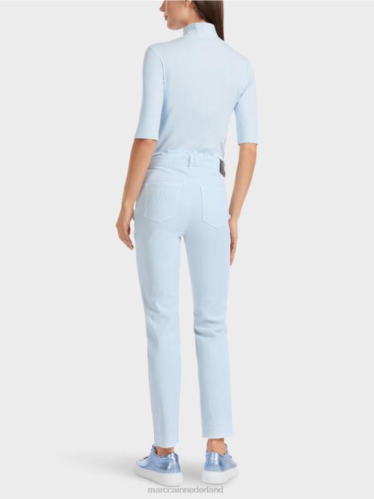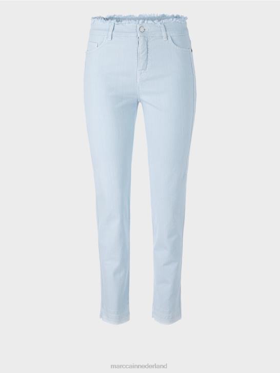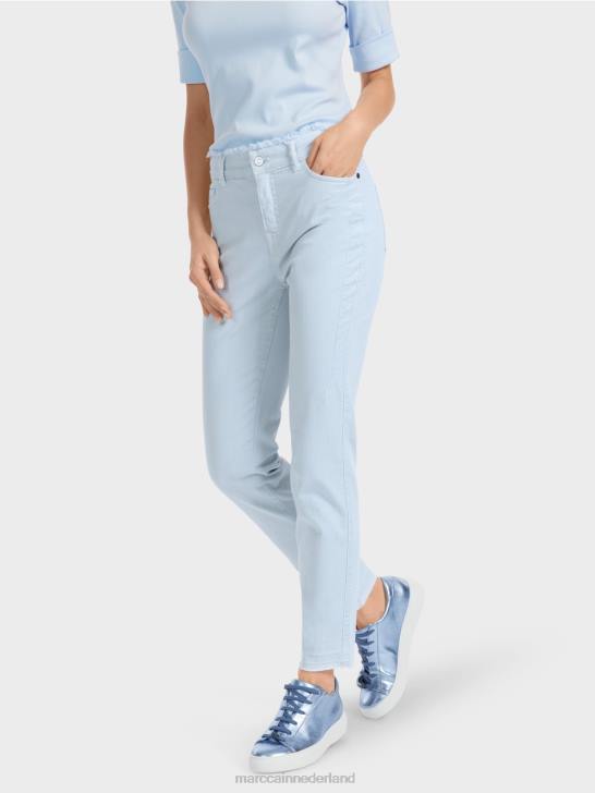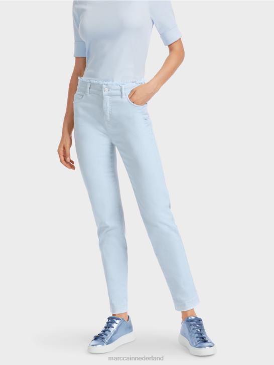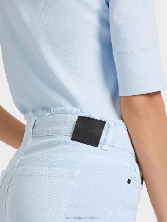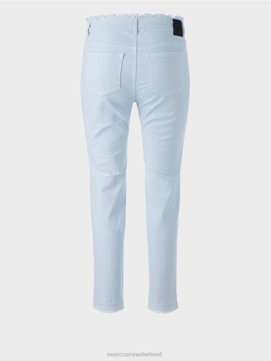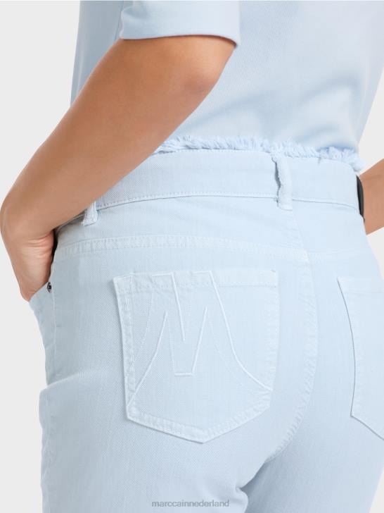 de jeans silea zijn gemaakt van biologisch katoen en dragen het duurzaamheidslabel ‘rethink Together’. de snit is smal en de beenvorm loopt taps toe naar de zoom toe. Een modieus kenmerk is de donkere zoom met franjes, waardoor het lijkt alsof de broek in doe-het-zelf-stijl is verlengd. vanaf de zak tot aan de knie loopt - evenwijdig aan de zijnaad - een coupenaad. op de linkerachterzak staat de m van het Marc Cain-opschrift in een geborduurde variant.