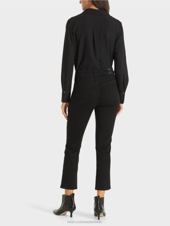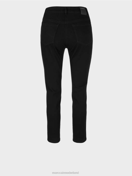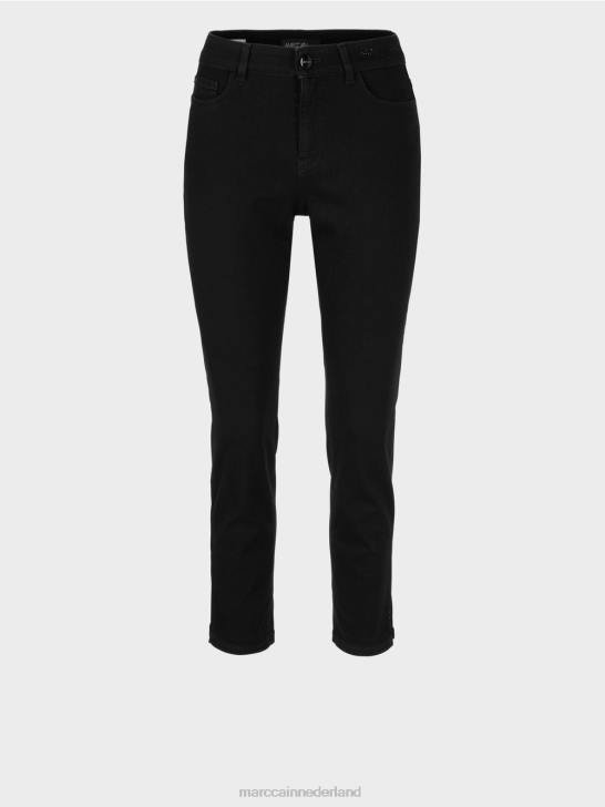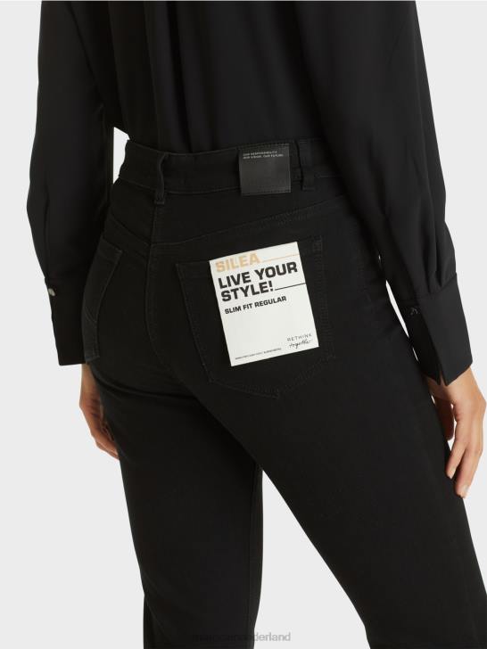 de jeans dragen het duurzaamheidslabel "samen heroverwegen" omdat ze gemaakt zijn van biologisch katoen. de beenuiteinden zijn voorzien van splitten en mini-strass steentjes. Ook het logo op de tailleband bestaat uit fonkelende sierstenen.