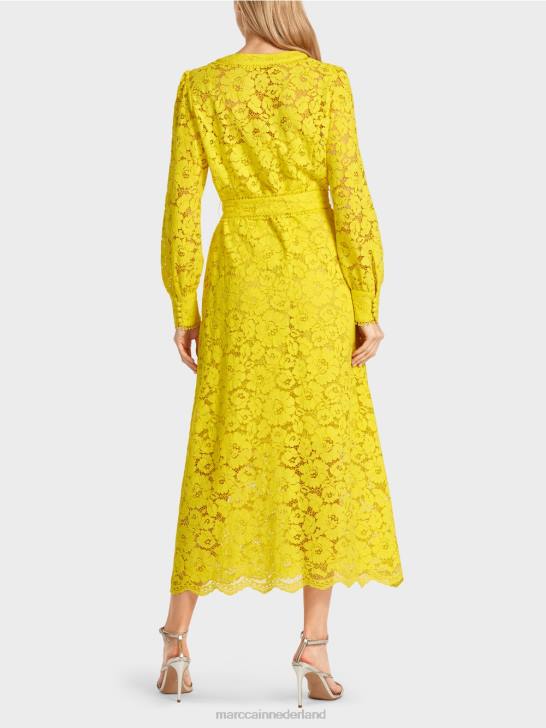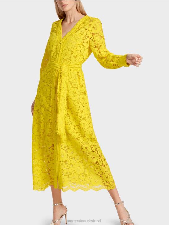 deze lange jurk is licht uitlopend. het biedt een minimalistisch ontwerp met all-over kant: v-hals, knoopsluiting over de volledige lengte en mouwen met manchetten. Decoratieve details zijn onder meer de bedekte knopen en het contrasterende kant aan de manchetten, wikkelriem en knoopsluiting. De jurk wordt geleverd met een knielange onderjurk.
