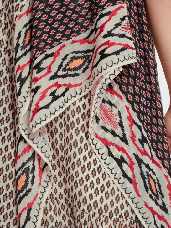 een elegante constructie en de gemengde patronen maken deze jurk uniek. de basisvorm is een a-lijn onderjurk met een laag aangezette volant. vanaf het decolleté heeft het item royale volants die aan de voorkant asymmetrisch zijn gerangschikt en aan de achterkant symmetrisch zijn geplaatst. de jurk is gevoerd.