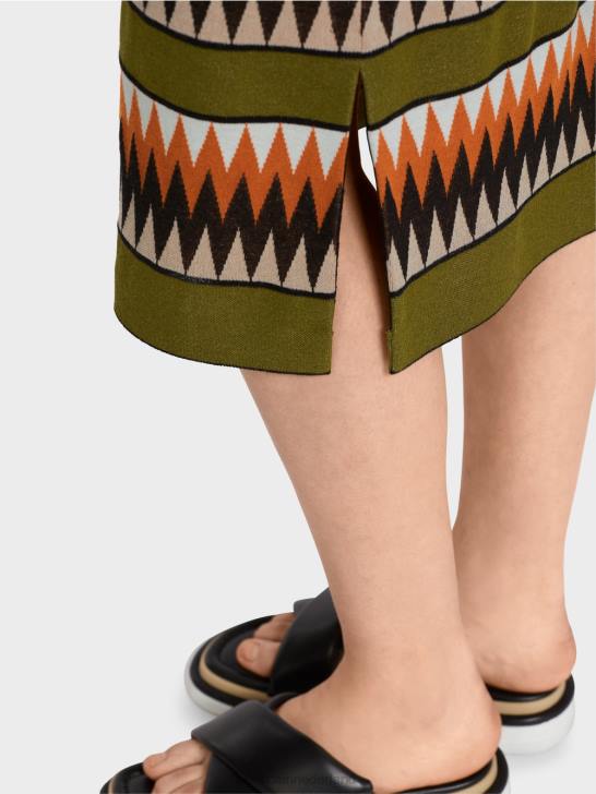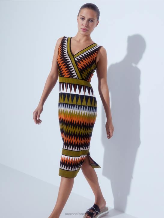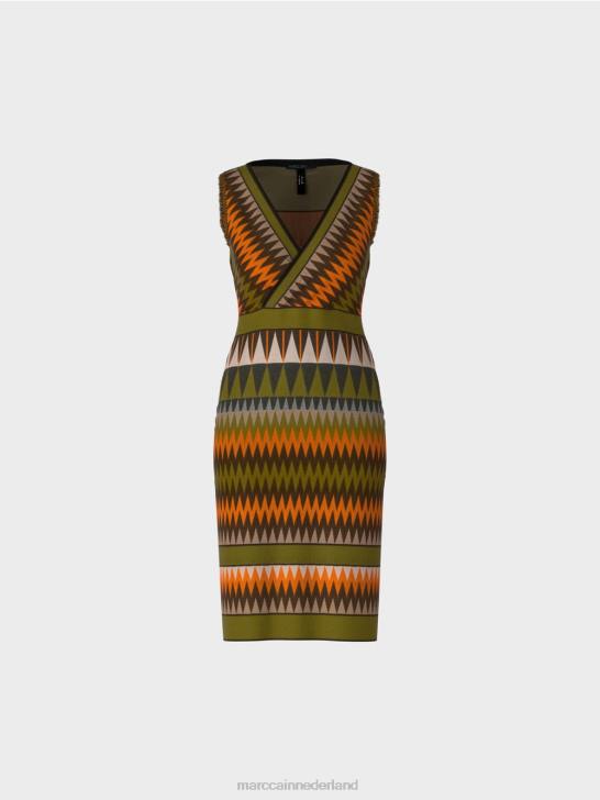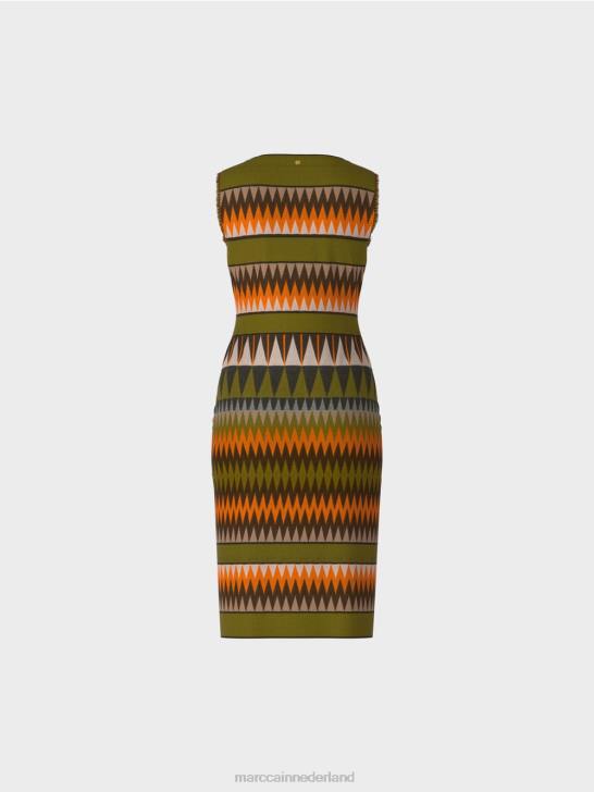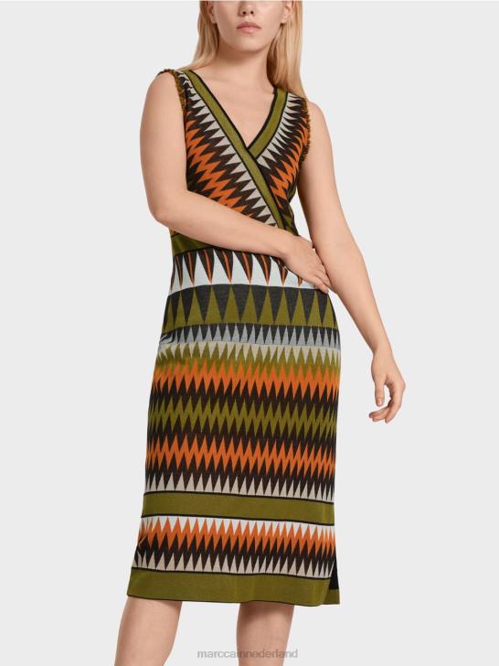 de kleuresthetiek doet denken aan mode uit de jaren 70 en zorgt in combinatie met het design voor een levendige uitstraling. deze nauwsluitende jurk is gevormd door figuurnaden. borstnaden aan de voorzijde en getailleerde naden aan de achterzijde. de top heeft een overslageffect. de franjes aan de armsgaten zorgen voor een stoer detail.