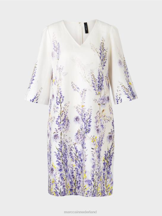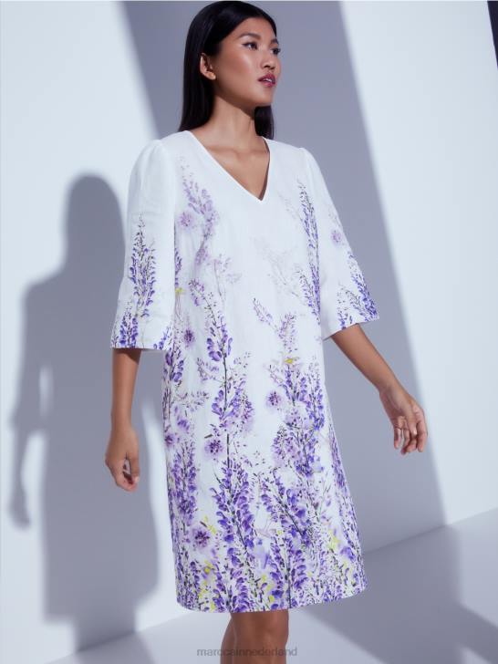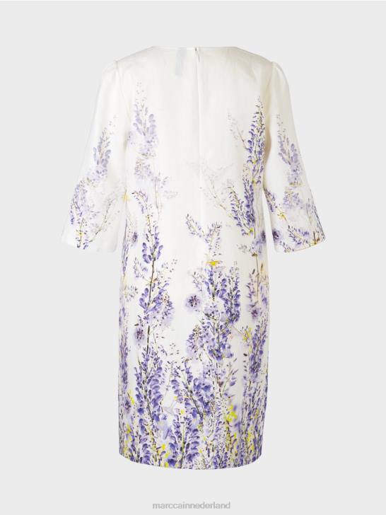 deze jurk is gemaakt van lichtgewicht, verkoelend linnen. het loopt wijd uit en heeft wijde 3/4-mouwen om een elegant silhouet te creëren. de a-lijn wordt geaccentueerd door de zoom, voorzien van een dichte blauweregenprint. De linnen jurk heeft een v-hals en wordt aan de achterkant gesloten met een ritssluiting.