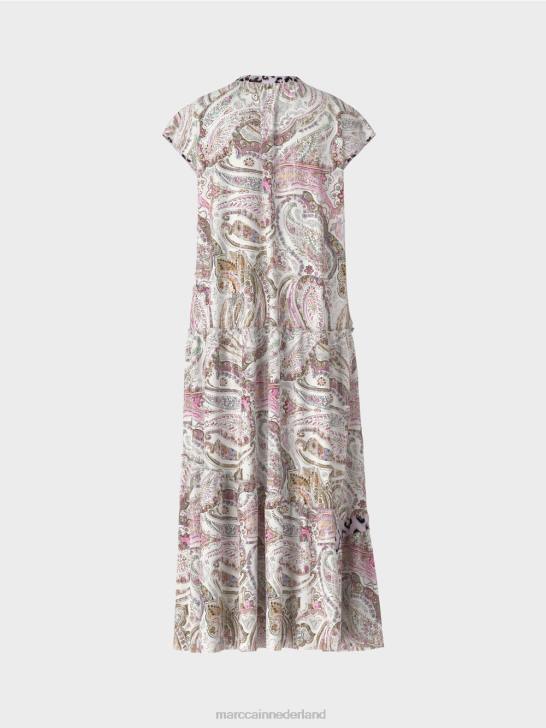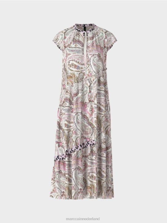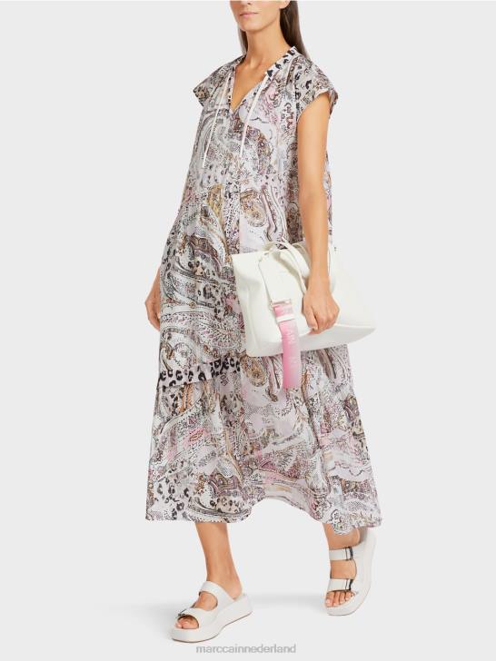 de jurk is van een katoen-zijdemix en valt licht en luchtig. het heeft een los, nauwsluitend silhouet. de asymmetrische lagen zorgen voor een wow-effect. De opstaande kraag heeft een trekkoord en wordt aan de voorkant vastgemaakt met een koord.