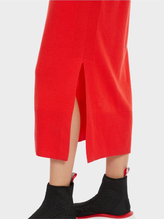 de gebreide jurk heeft smalle schouders en is vanaf de mouw nonchalant wijd. extra bewegingsvrijheid wordt geboden door de zijsplit. de sportieve touch komt via geribde gebreide inzetstukken op de schouder en zijnaad - en een kraagoplossing die een v-hals en een polokraag combineert. het kasjmiergehalte maakt het breisel superzacht op de huid.