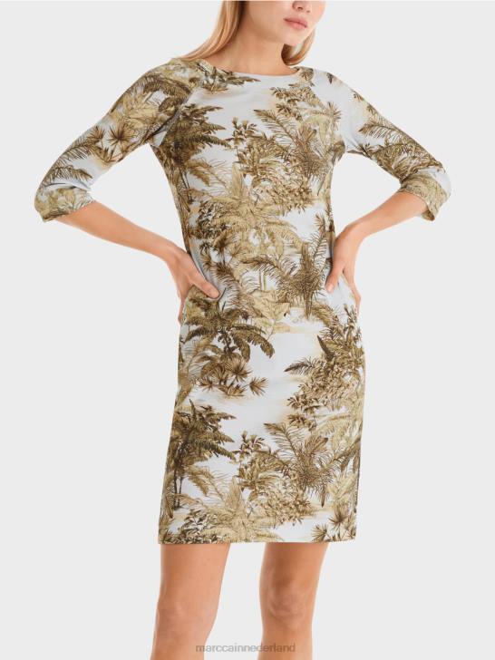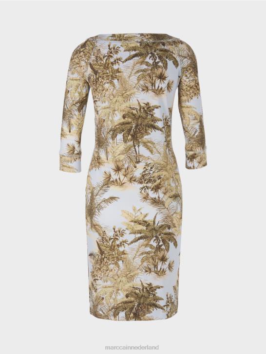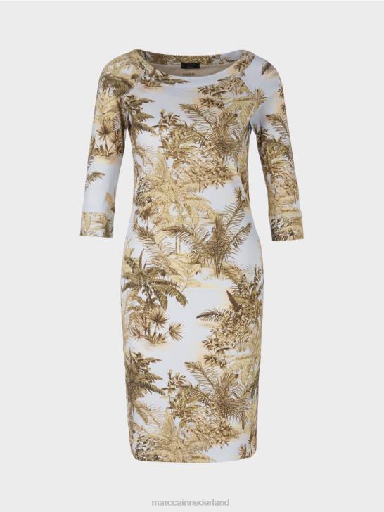 nauwsluitende jurk van stretchkatoen voor perfect comfort. het hoogtepunt is de exotische palmboomprint die ieders aandacht trekt. het model heeft driekwart mouwen en een ronde halslijn.
