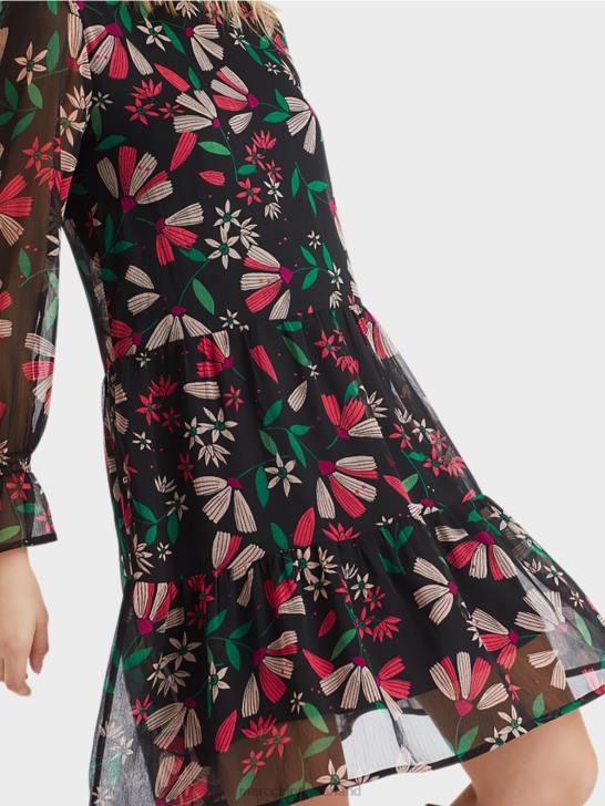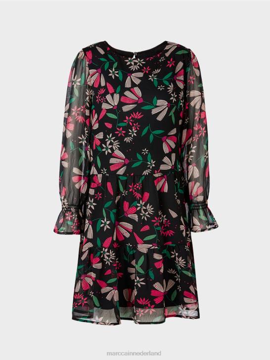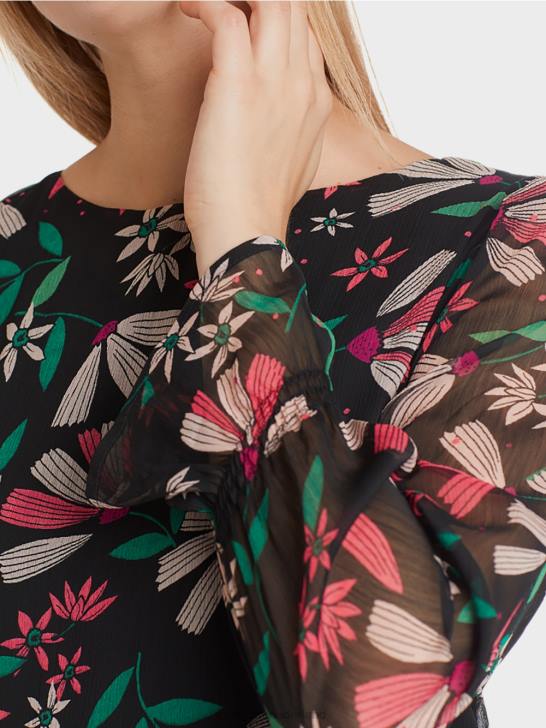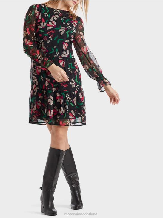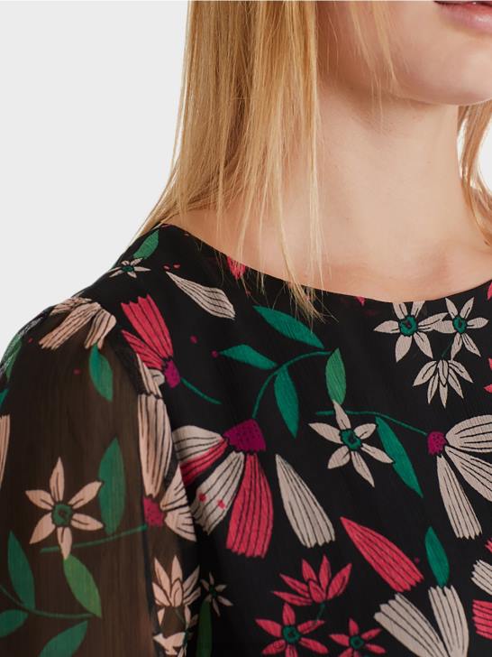 stijlvolle jurk met wijd zwierig silhouet in luchtige lichte crêpe kwaliteit. de vrouwelijke jurk is all-over versierd met een kleurrijke bloemenprint. gelaagde volants en fijne smokdetails op de mouwen geven de jurk een romantische uitstraling.