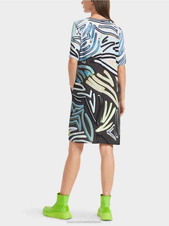 de jurk heeft een raglanmouwen en loopt licht uitlopend. Het heeft geen sluiting en kan moeiteloos worden overgetrokken. de doorlopende voering zorgt voor een altijd harmonieuze drapering. het printontwerp is geïnspireerd op moderne schilderkunst en geaccentueerd met fluorkleuren.