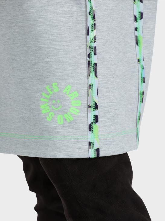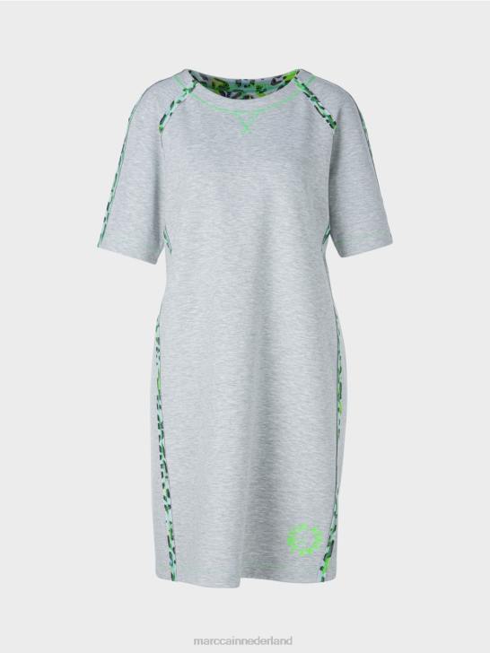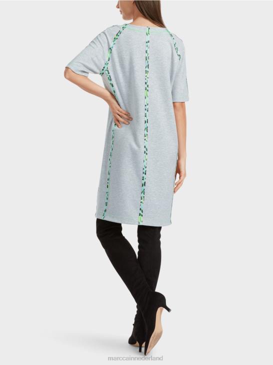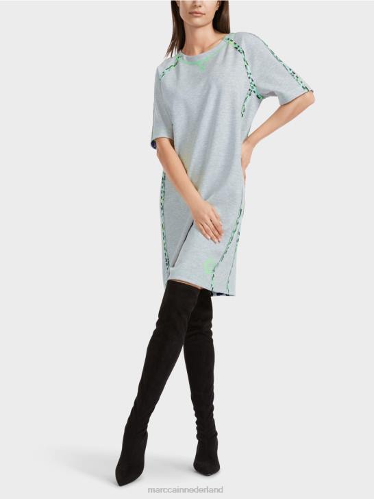 de jurk heeft een raglanmouwen en is wijd en recht uitgesneden. het dubbelzijdige materiaal is zacht en flexibel. de binnenkant is gevlekt. de buitenkant is voorzien van een graffiti-achtige all-over print met gestileerde hartjes en letters. levendige accenten worden gezet met stiksels in fluorkleuren.