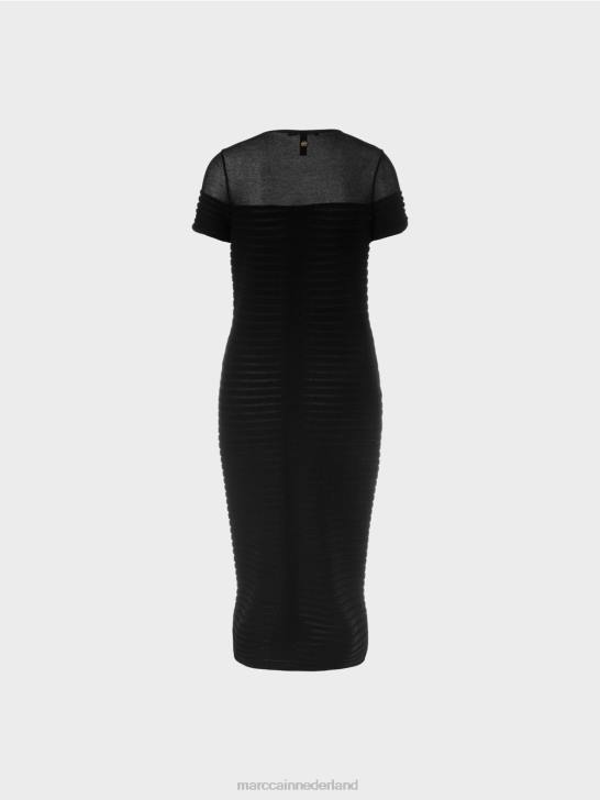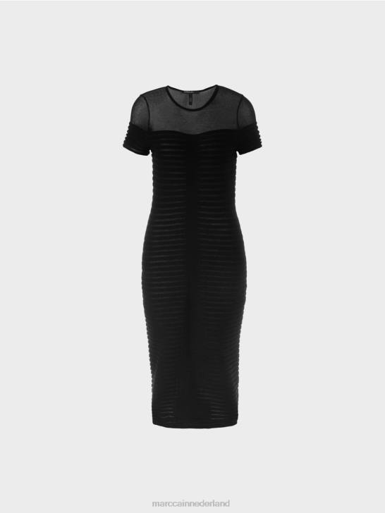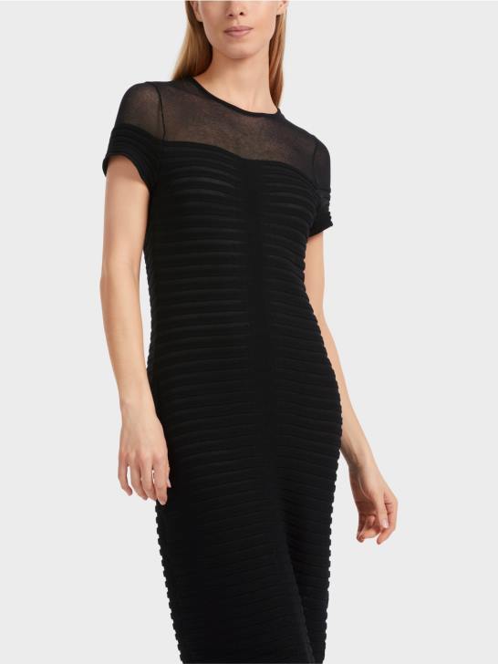 jurk in een katoenmix van het duurzaamheidslabel "rethink Together". De jurk is nauw aansluitend op het figuur gesneden en heeft een ronde hals en licht doorschijnend materiaal in gestreepte look. het artikel is "gebreid in Duitsland": het breien van de garens op ultramoderne breimachines en het afwerken van de stoffen gebeurt in Duitsland. de afzonderlijke onderdelen, zoals mouwen, voorpand enz., worden in Europese partnerbedrijven aan elkaar genaaid.