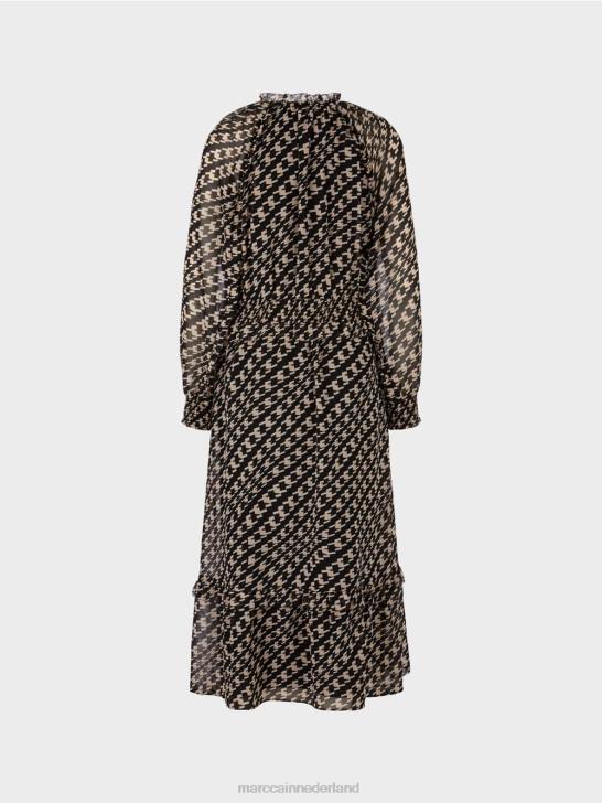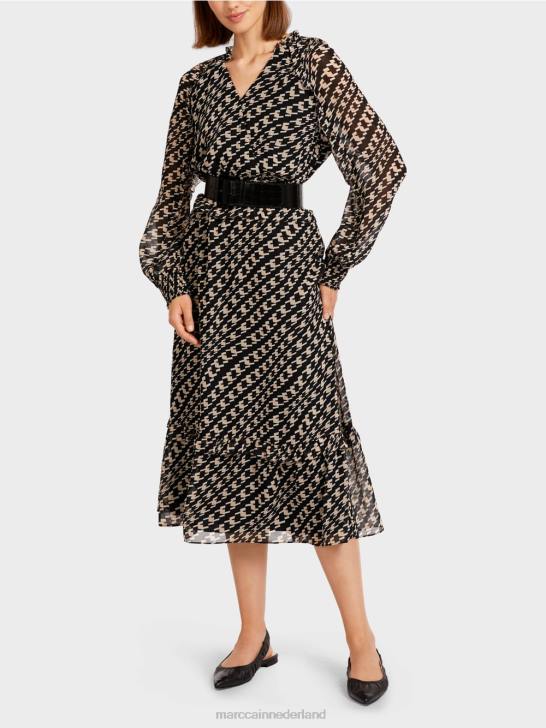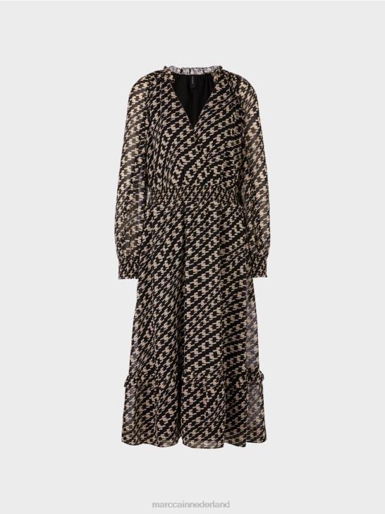 vrouwelijke jurk met ruches en gekruiste halslijn. het geometrische patroon van deze jurk contrasteert prachtig met het romantische silhouet. het pronkt met een gekruiste halslijn en speelse ruchedetails op de raglanmouwen, kraag en zoom. een gesmokte taille en elastische manchetten versterken de romantische stijl.