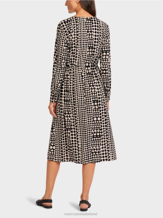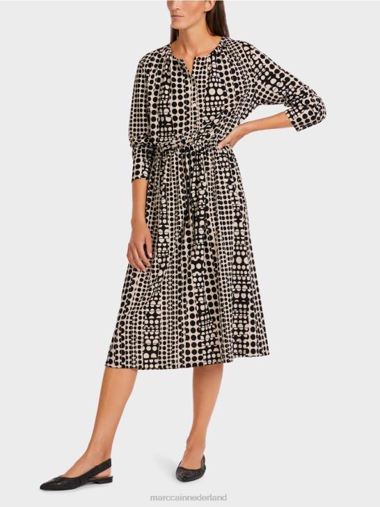 jurk geïnspireerd op de stijl van de jaren zeventig met een op-art patroon. de halslijn met trekkoord voegt een vleugje elegantie toe. het rokgedeelte is aan het lijfje bevestigd en heeft een trekkoord om de wijdte aan te passen.